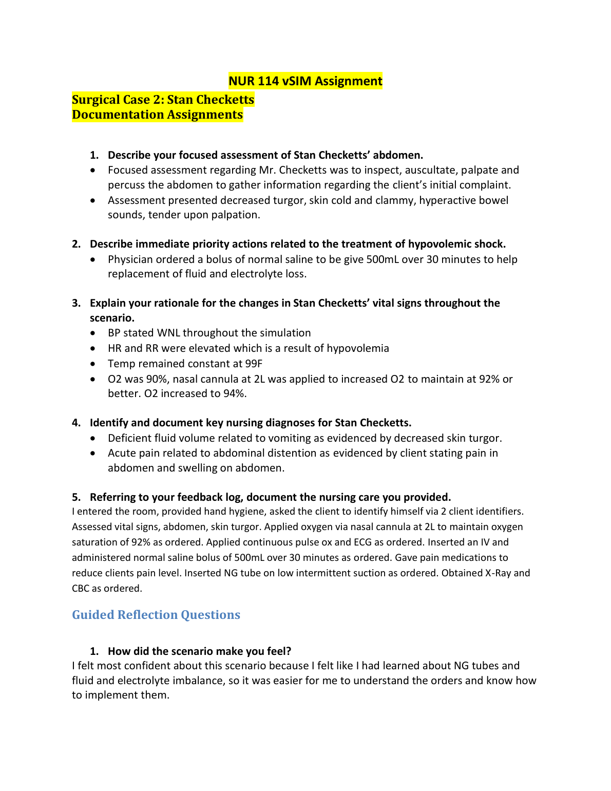 NUR 114 vSIM Assignment Surgical Case 2: Stan Checketts Documentation Assignments FOR 2023/2024