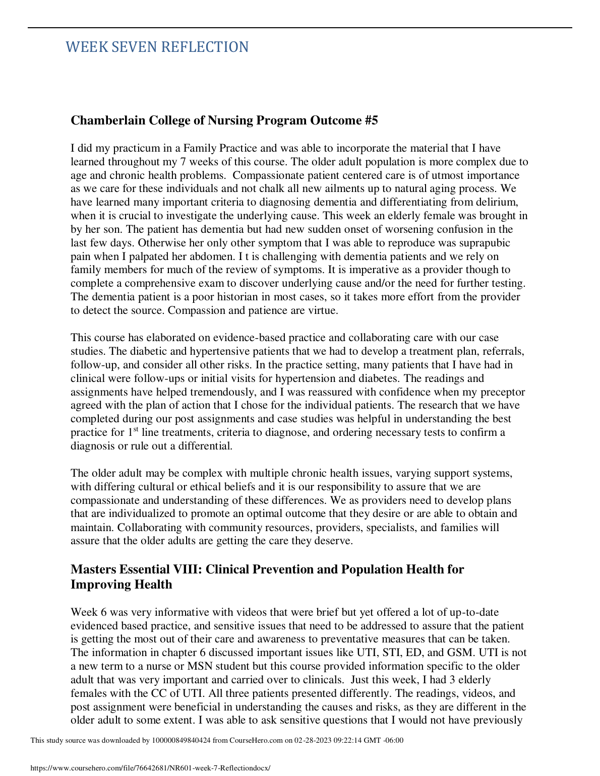 NR 601 WEEK SEVEN REFLECTION Chamberlain College of Nursing Program Outcome #5 2023. DOWNLOAD ON www.Hackedexams.com INSTANTLY.