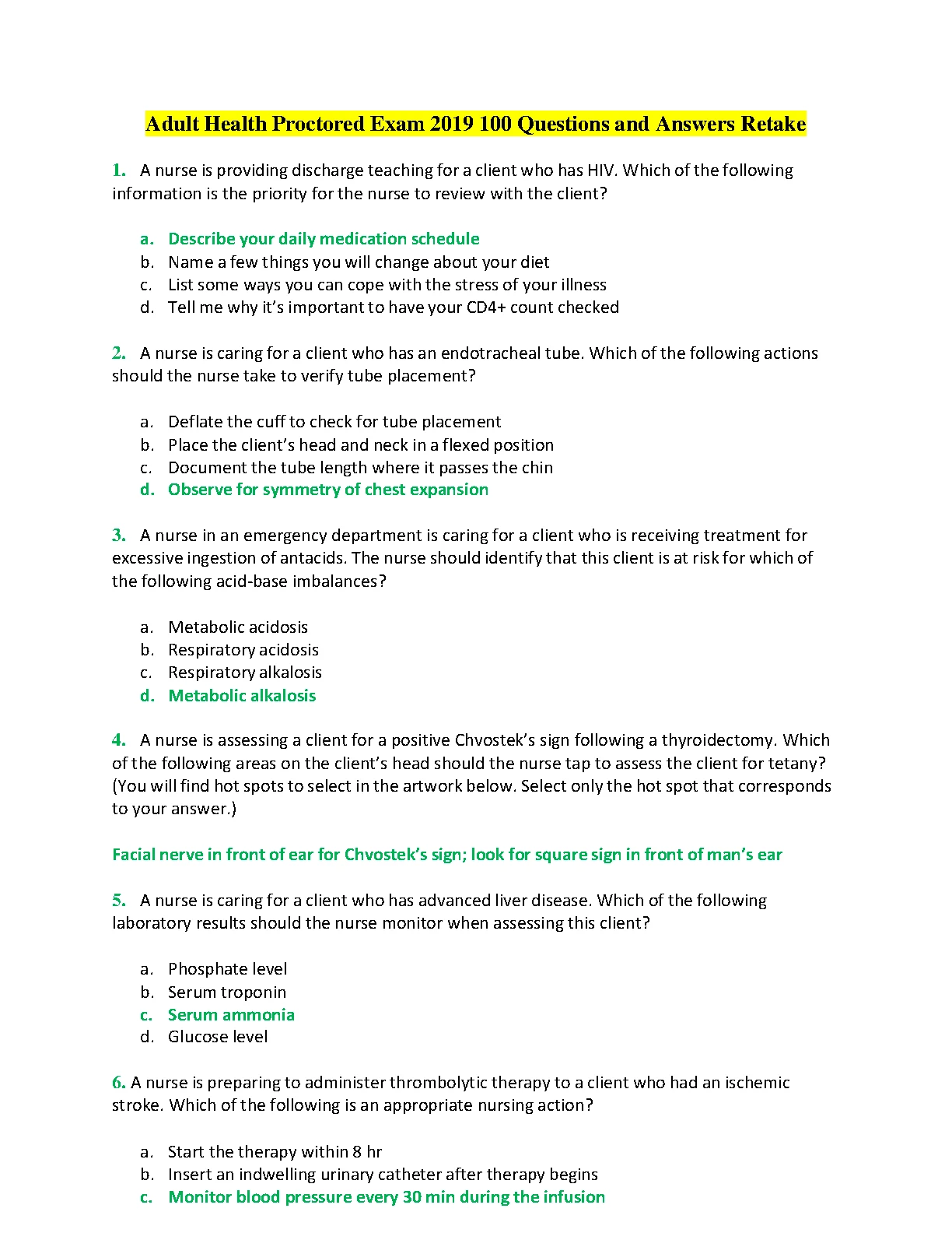Adult Health Proctored Exam 2019. Questions and Answers Retake 2023