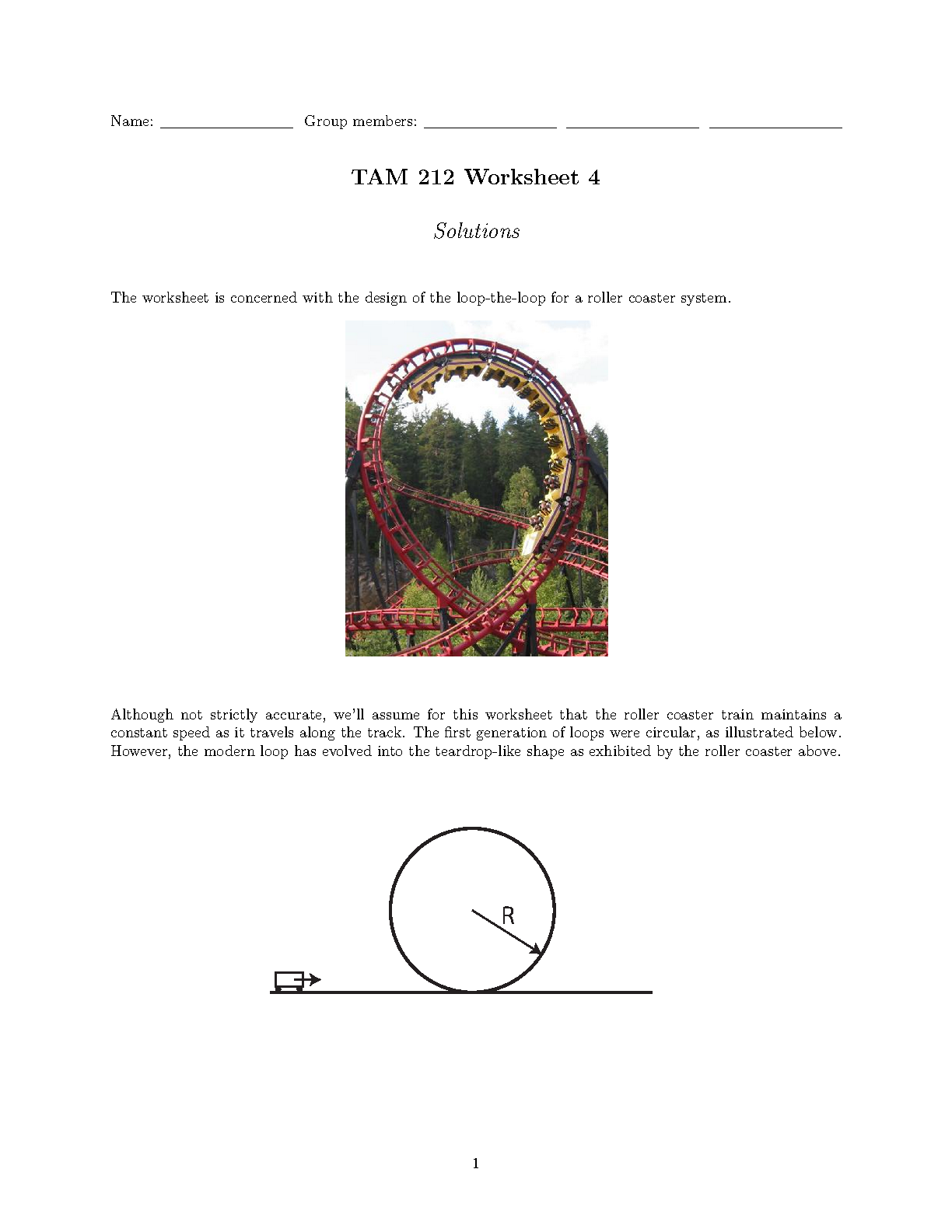TAM 212 Introductory Dynamics: Complete Solutions for Worksheet 4 - Roller Coaster Mechanics