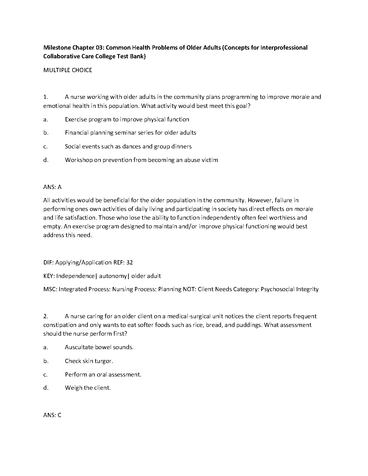 Milestone Chapter 03: Common Health Problems of Older Adults (Concepts for Interprofessional Collaborative Care College Test Bank) 2023. DOWNLOAD INSTANTLY on www.hackedexams.com INSTANTLY