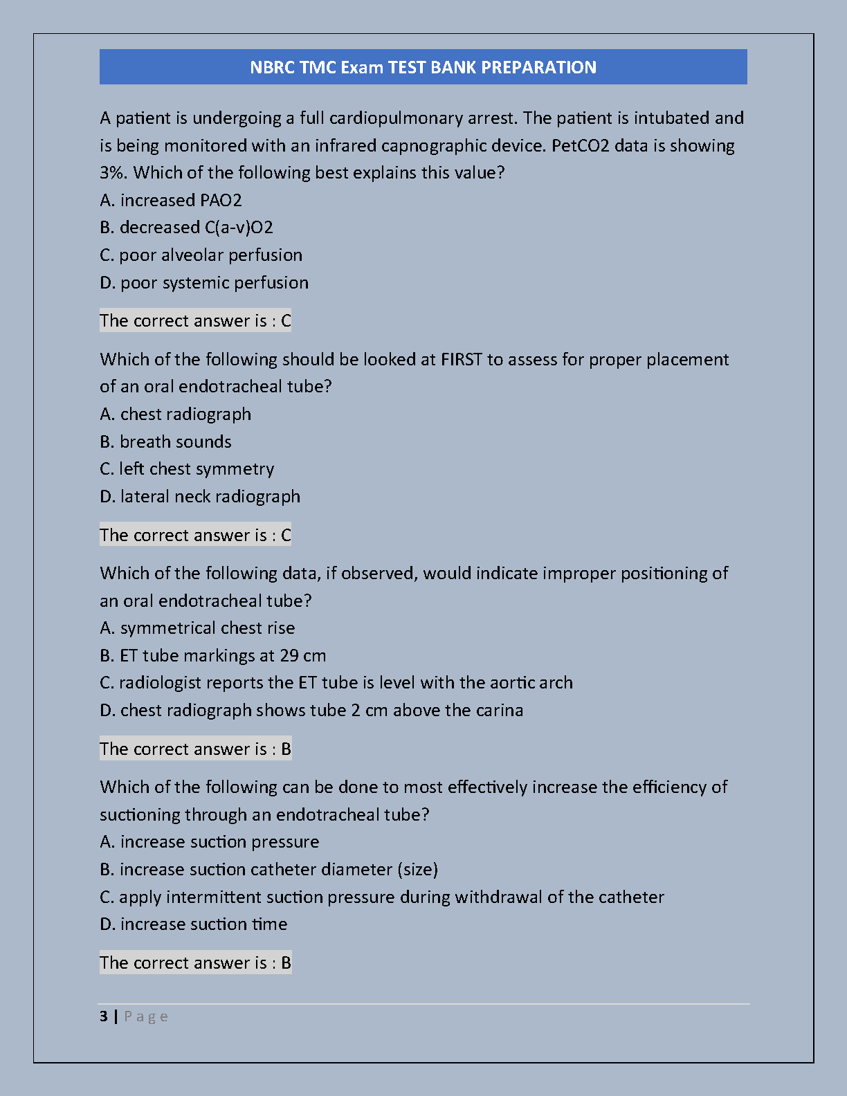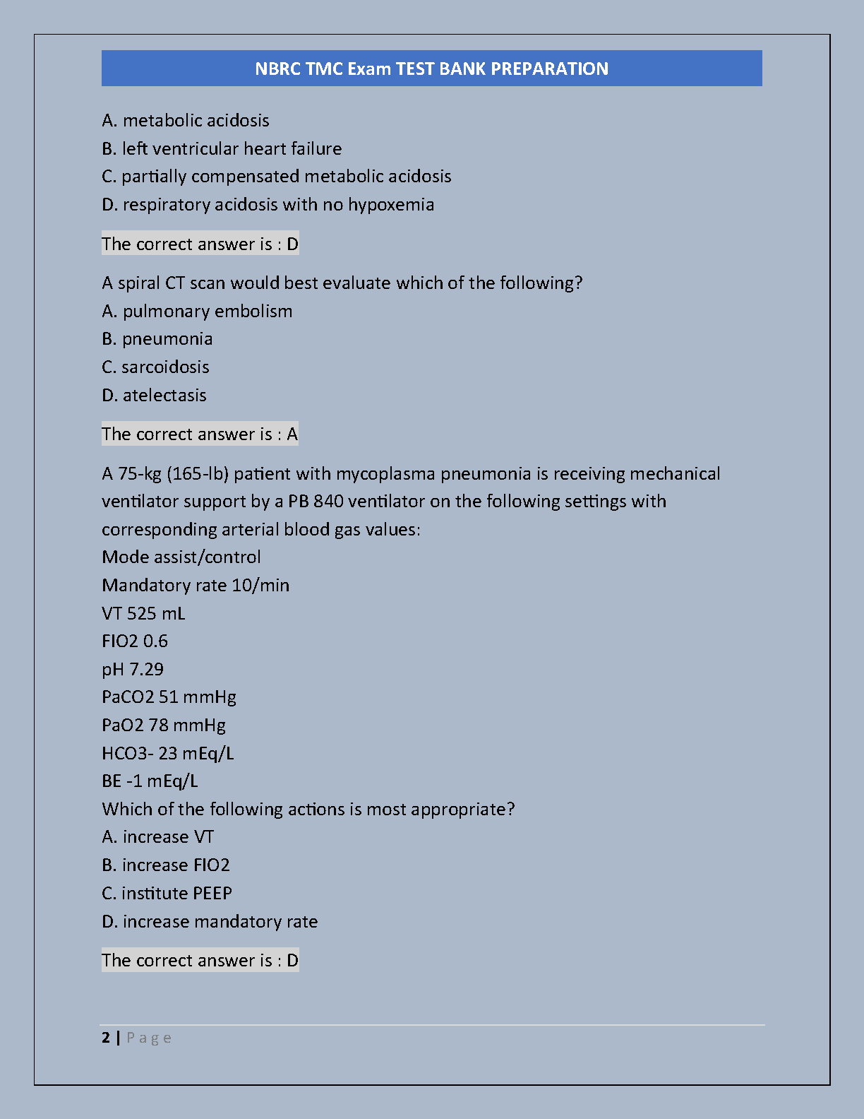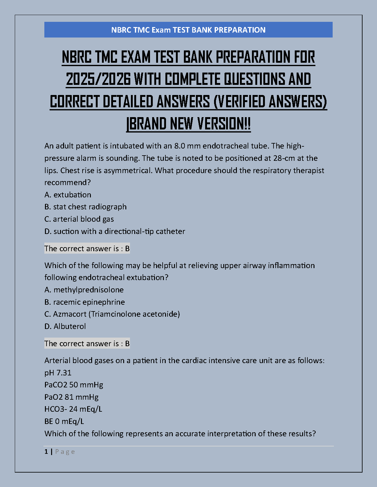 Get fully prepared to ace your National Board for Respiratory Care (NBRC) Therapist Multiple-Choice (TMC) Exam with our brand new, updated test bank for the 2025-2026 session. This comprehensive resource features a complete collection of exam-style questions, each accompanied by a correct, verified, and detailed answer. Master key concepts in respiratory care, from patient assessment and arterial blood gas interpretation to mechanical ventilation scenarios. Our NBRC TMC Test Bank is meticulously designed to mirror the actual exam, helping you build confidence, identify knowledge gaps, and pass on your first attempt, avoiding costly resits. Start your journey to becoming a certified respiratory therapist today!