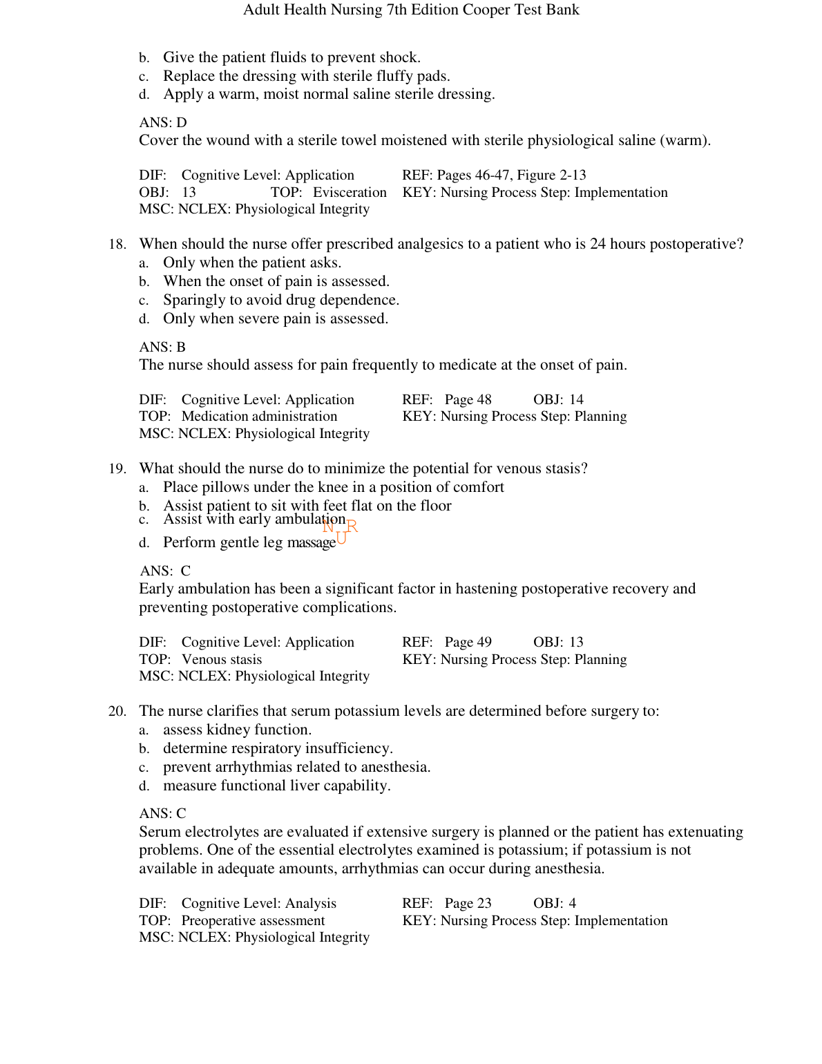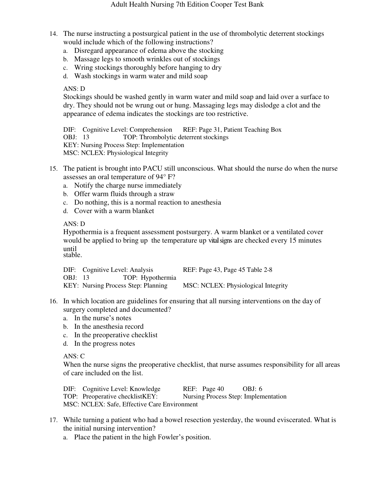 Test Bank For Adult Health Nursing 7th Edition Cooper (Chapter 2: Care of the Surgical Patient)