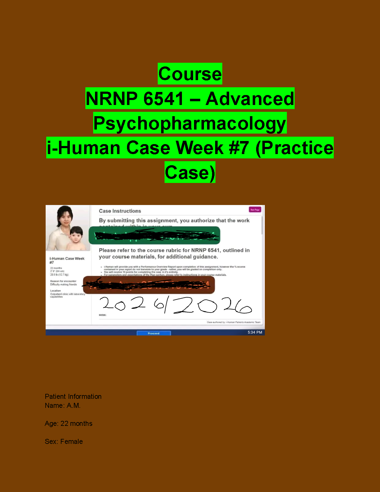 NRNP 6541 Advanced Psychopharmacology i-Human Case Week 7: Patient A.M. (22-Month-Old Female) - Latest 2025/2026 Study Guide based on Stahl’s Essential Psychopharmacology 6th Edition by Stephen M. Stahl - Pass First Attempt & Avoid Resits