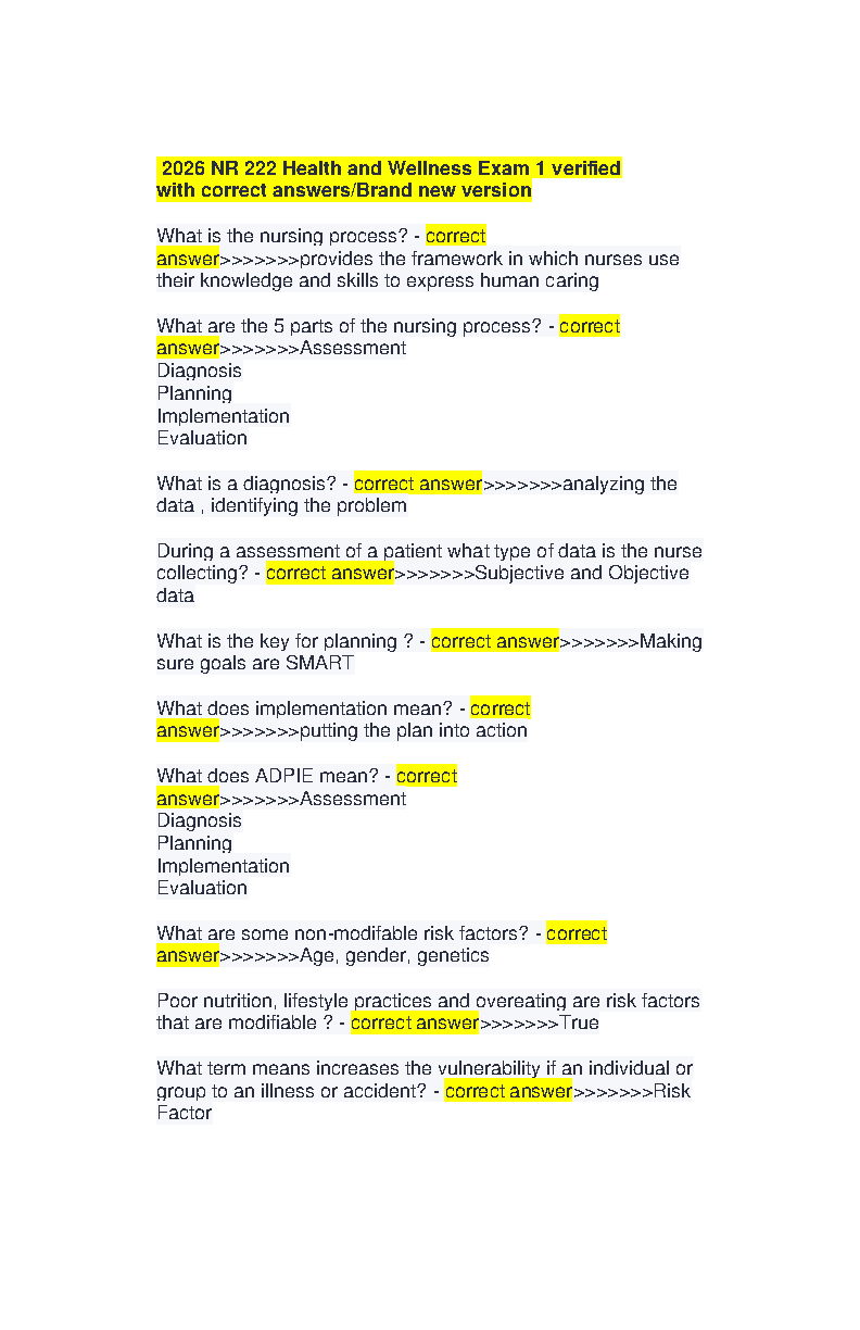 Elevate your study sessions with this premium 2025/2026 NR509 Midterm Exam Review, specifically engineered to help advanced nursing students pass their exams on the first try and avoid the stress of resits. This comprehensive guide features high-yield practice questions and in-depth rationales aligned with the 10th edition of Seidel’s Guide to Physical Examination by Jane W. Ball, Joyce E. Dains, John A. Flynn, Barry S. Solomon, and Rosalyn W. Stewart. Master critical FNP assessment skills, including musculoskeletal diagnostics, osteoporosis definitions, and joint evaluation (crepitation). Gain the confidence you need for clinical excellence with this essential academic resource.