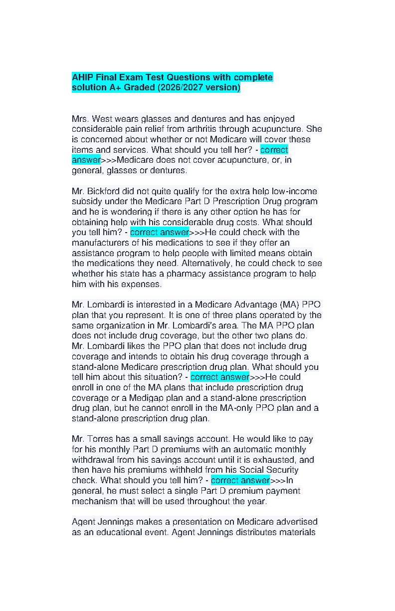 Prepare for success with this definitive AHIP certification study resource, updated for the 2025/2026 academic year. This guide features actual final exam practice questions and A+ graded solutions covering vital Medicare topics, including Part D prescription drug subsidies, Medicare Advantage (MA) PPO plan regulations, and specific coverage exclusions like acupuncture and dentures. Expertly designed to help students master complex insurance scenarios, this resource ensures you are fully prepared to pass your exam on the very first attempt, eliminating the stress of resits. Stay current with the latest 2026/2027 version insights provided by America's Health Insurance Plans (AHIP).