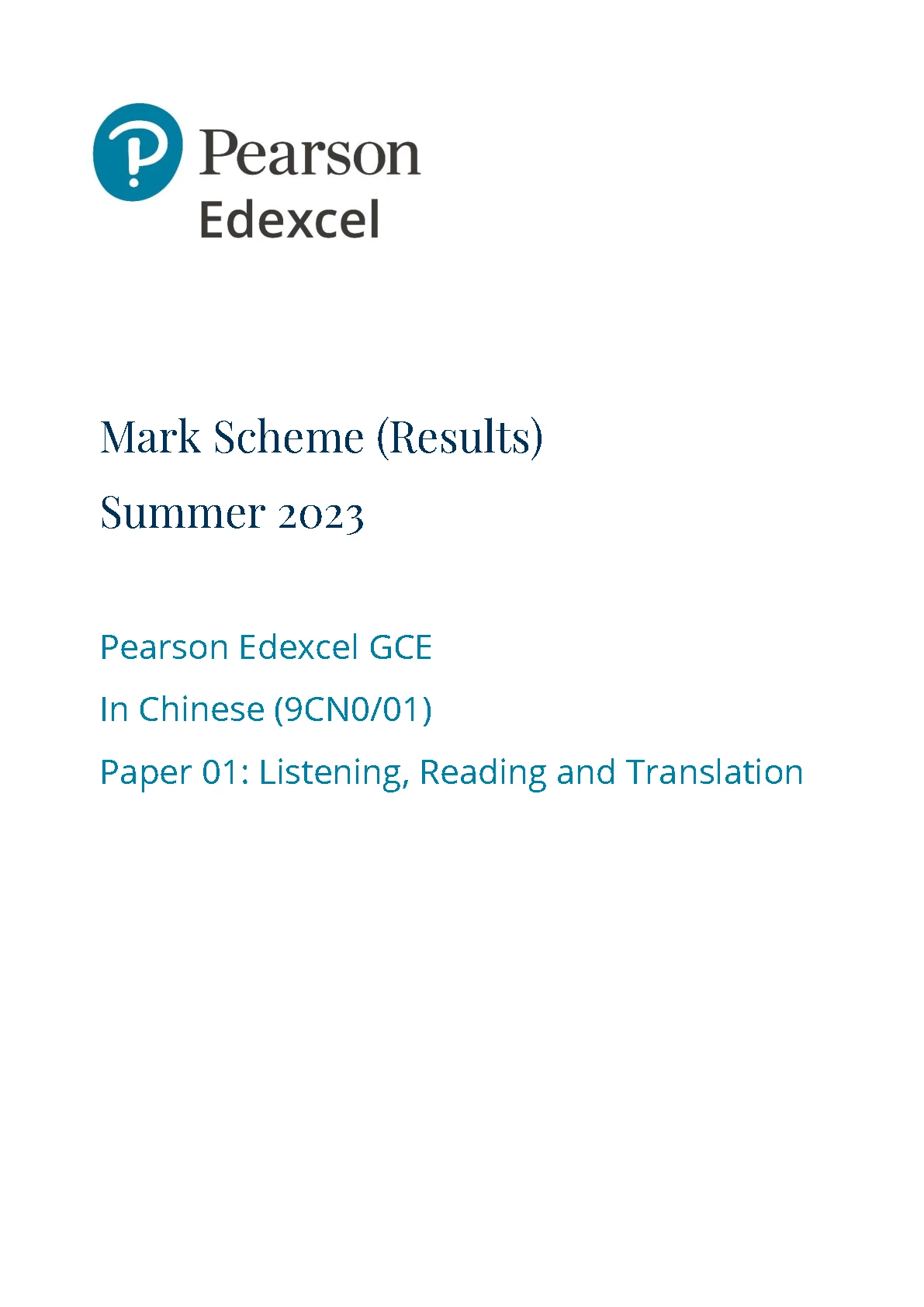 PEARSON EDEXCEL A LEVEL Chinese PAPER 1 2023 MARK SCHEME (9CN0/01: Listening, Reading and Translation). DOWNLOAD OFFICIAL AND VERIFIED EDEXCEL PEARSON A LEVEL Chinese PAPER 1 2023 on www.hackedexams.com INSTANTLY.