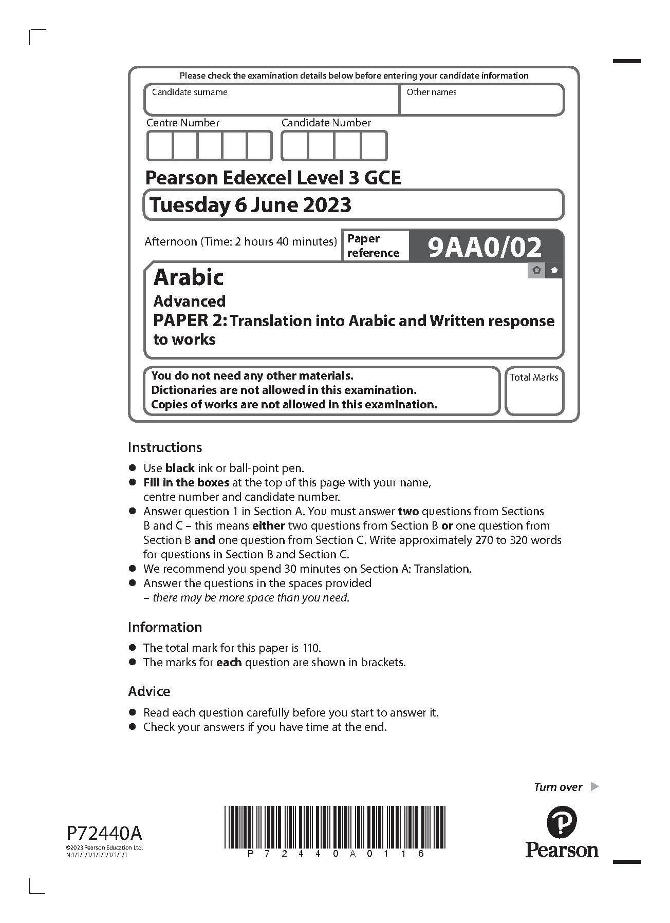 PEARSON EDEXCEL A LEVEL ARABIC PAPER 2 2023 (9AA0/02: Translation into Arabic and Written response to works)