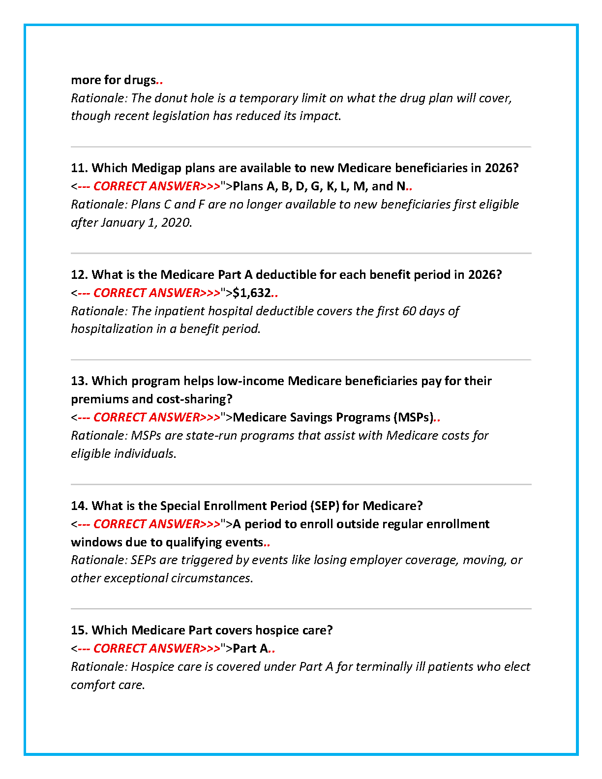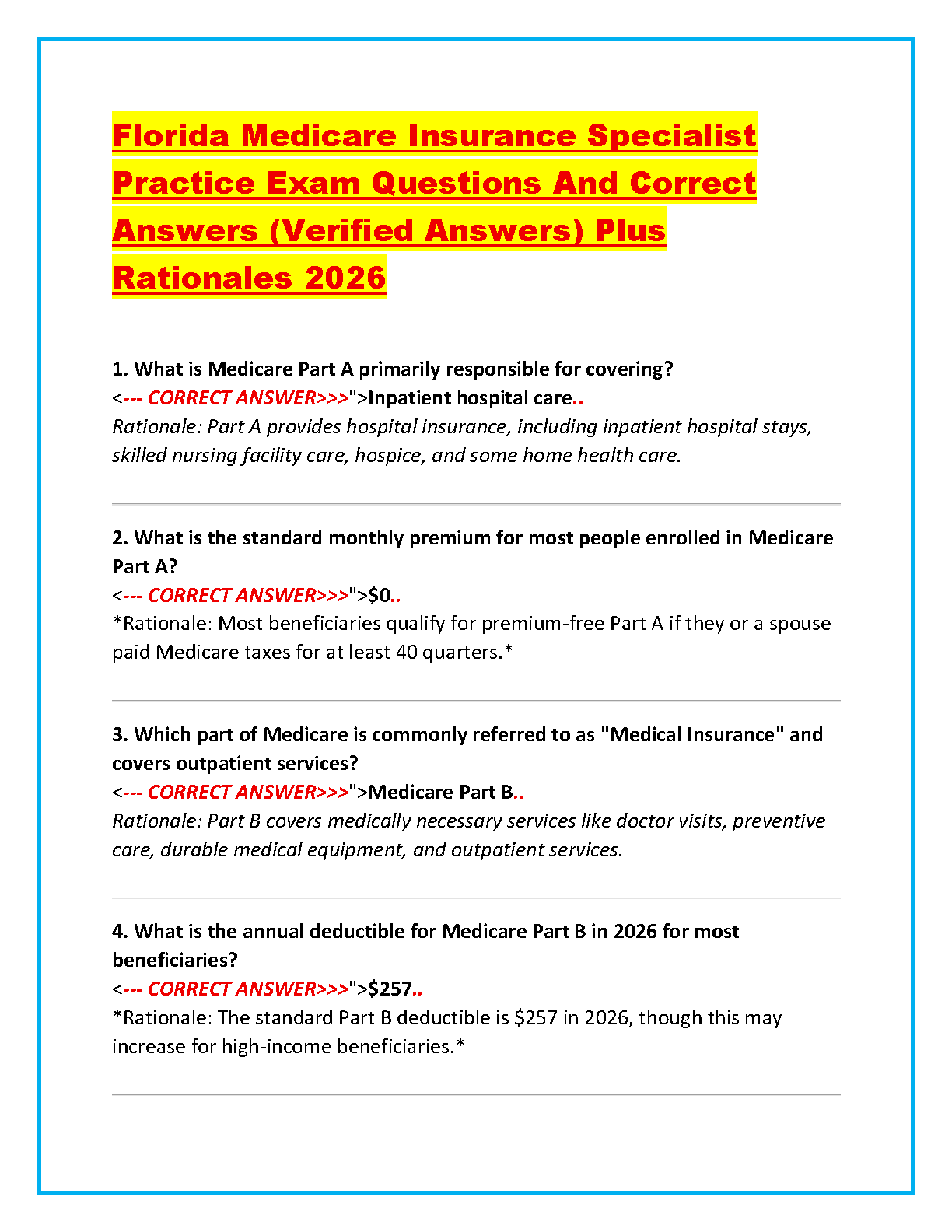 Ensure success on your certification journey with the most up-to-date Florida Medicare Insurance Specialist resource, specifically released for the 2025/2026 academic year. This comprehensive study guide features high-yield practice exam questions, verified correct answers, and in-depth rationales for key topics including Medicare Part A and Part B benefits, premiums, and deductibles. Expertly designed to help you master the material and pass your exam on the very first attempt, this guide is your essential tool to avoid costly resits and fast-track your career in insurance.