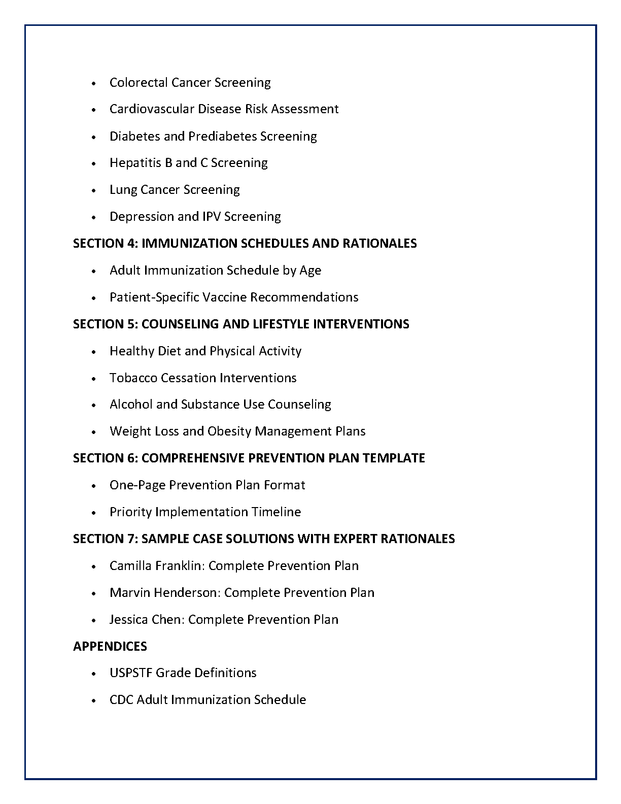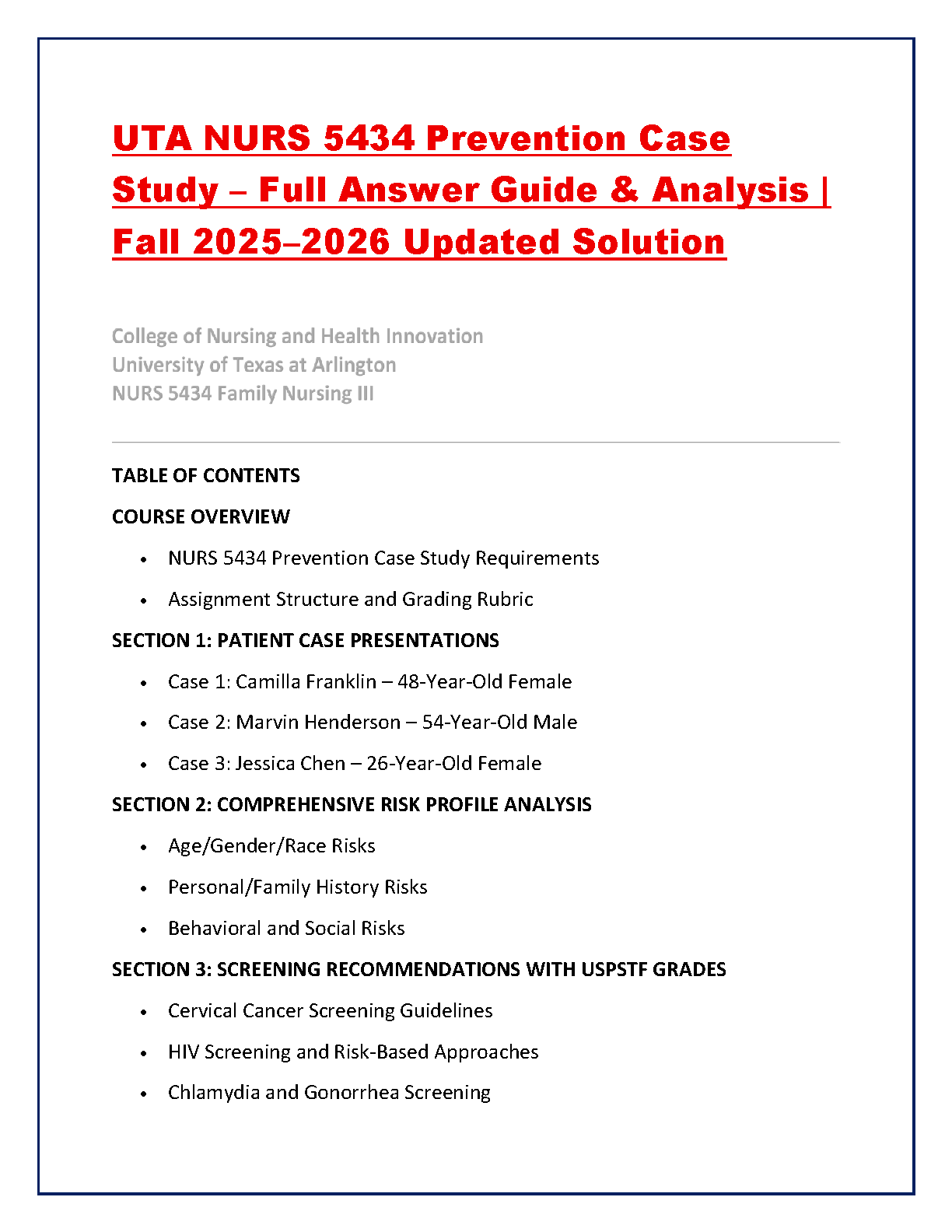 Elevate your performance in Family Nursing III with this definitive guide for the UTA NURS 5434 Prevention Case Study, specifically released for the 2025/2026 academic year. This resource provides exhaustive answers and clinical analysis for the core cases of Camilla Franklin, Marvin Henderson, and Jessica Chen. It features detailed comprehensive risk profile assessments—incorporating age, gender, race, behavioral, and family history factors—alongside evidence-based screening recommendations utilizing USPSTF grades for cervical cancer, HIV, and STI protocols. This updated solution is the ultimate tool to help nursing students master preventative care and succeed on their first exam attempt, avoiding the need for resits.