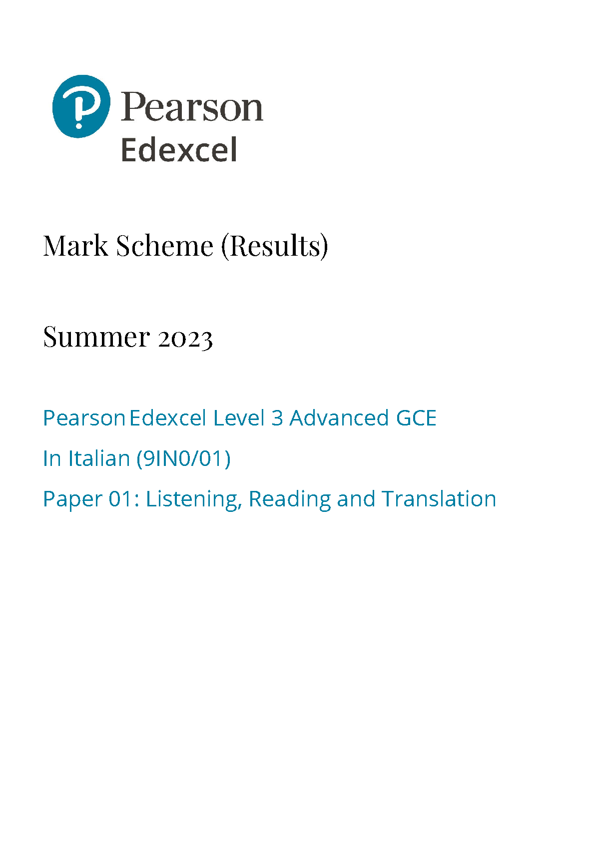 PEARSON EDEXCEL A LEVEL Italian PAPER 1 2023 MARK SCHEME (9IN0/01: Listening, Reading and Translation)