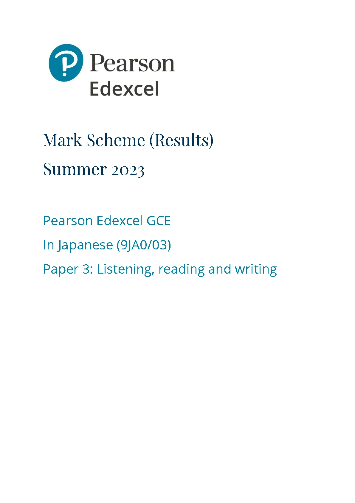 PEARSON EDEXCEL A LEVEL Japanese PAPER 3 2023 MARK SCHEME (9JA0/03: Listening, reading and writing). DOWNLOAD OFFICIAL AND VERIFIED EDEXCEL PEARSON A LEVEL Japanese PAPER 3 2023 on www.hackedexams.com INSTANTLY.