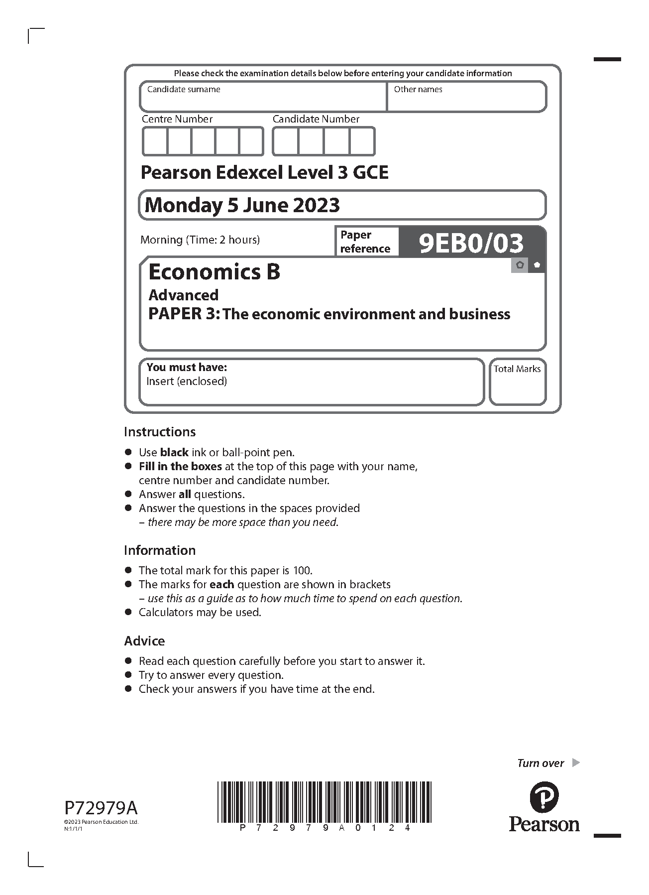 PEARSON EDEXCEL A LEVEL ECONOMICS B PAPER 3 2023 (9EB0/03: The economic environment and business)