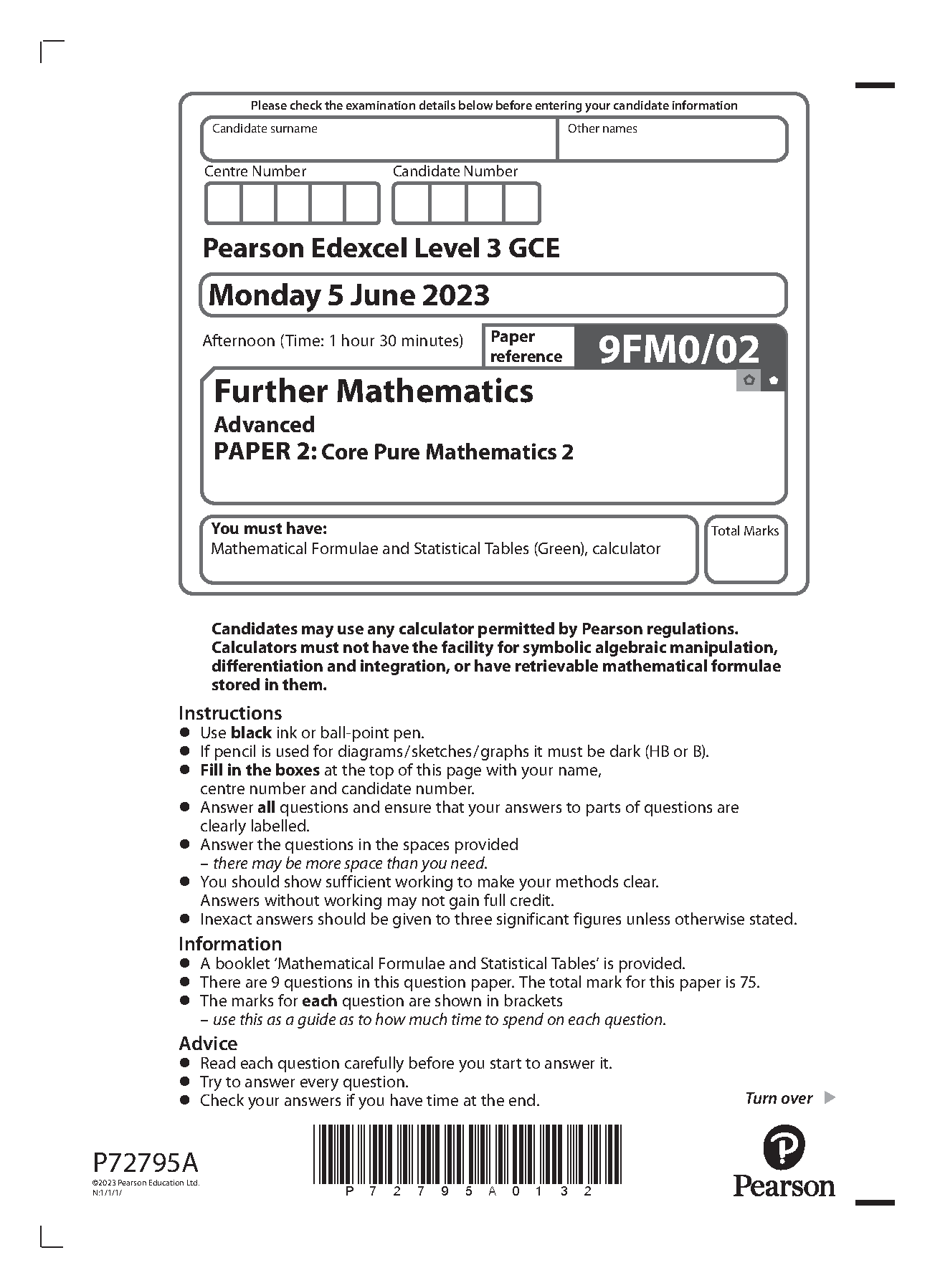 PEARSON EDEXCEL A LEVEL FURTHER MATHEMATICS PAPER 2 2023 (9FM0/02: Core Pure Mathematics 2)
