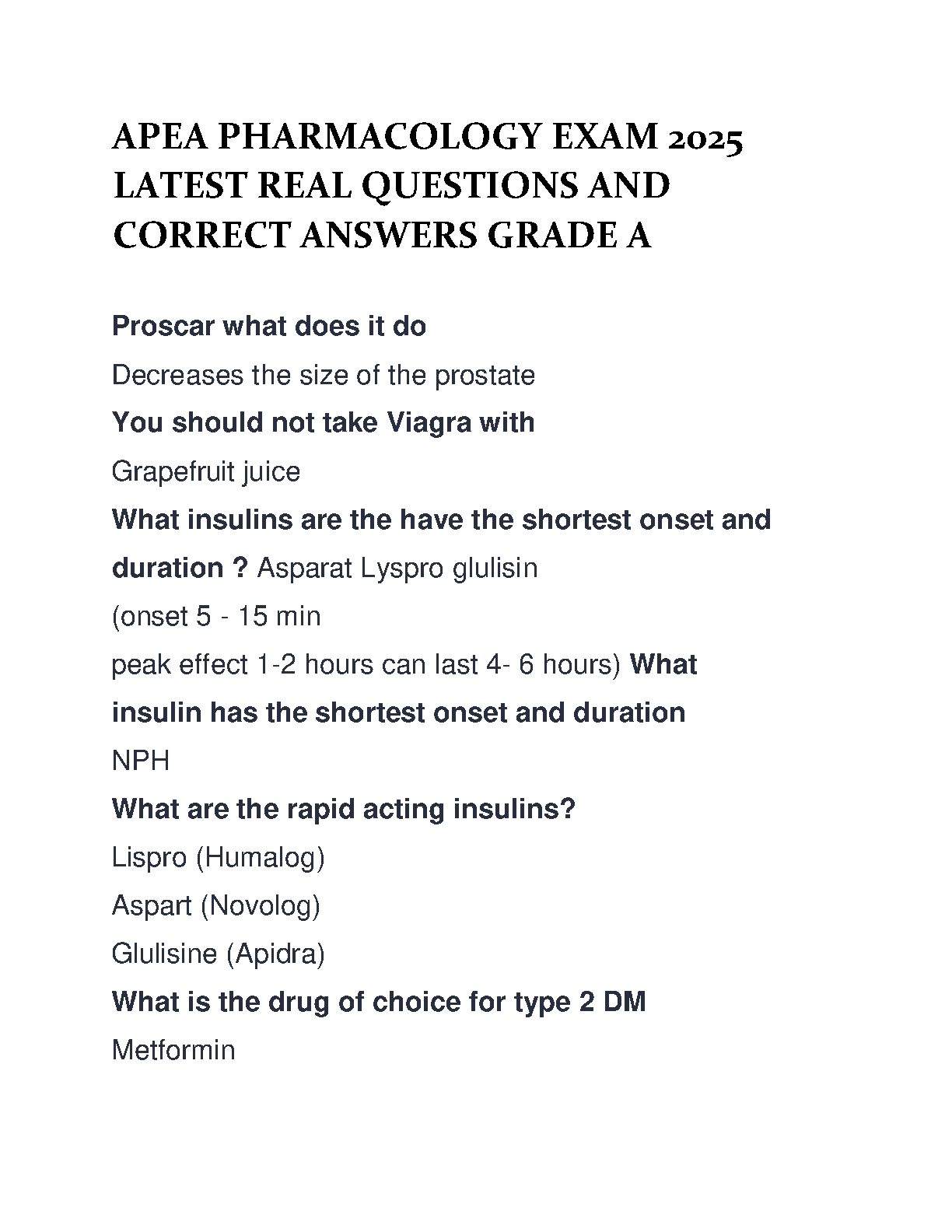 Prepare for clinical excellence and exam victory with this comprehensive 2025/2026 APEA Pharmacology study resource. Curated by experts Amelie Hollier and Mimi Secor, this guide features the latest real-world questions and detailed correct answers covering vital topics like insulin pharmacokinetics, medication contraindications (e.g., Viagra and Proscar), and Type 2 Diabetes management protocols. This material is specifically designed as the most effective tool to help nursing students master complex drug concepts and pass their certification exams on the first attempt, effectively avoiding the need for resits.