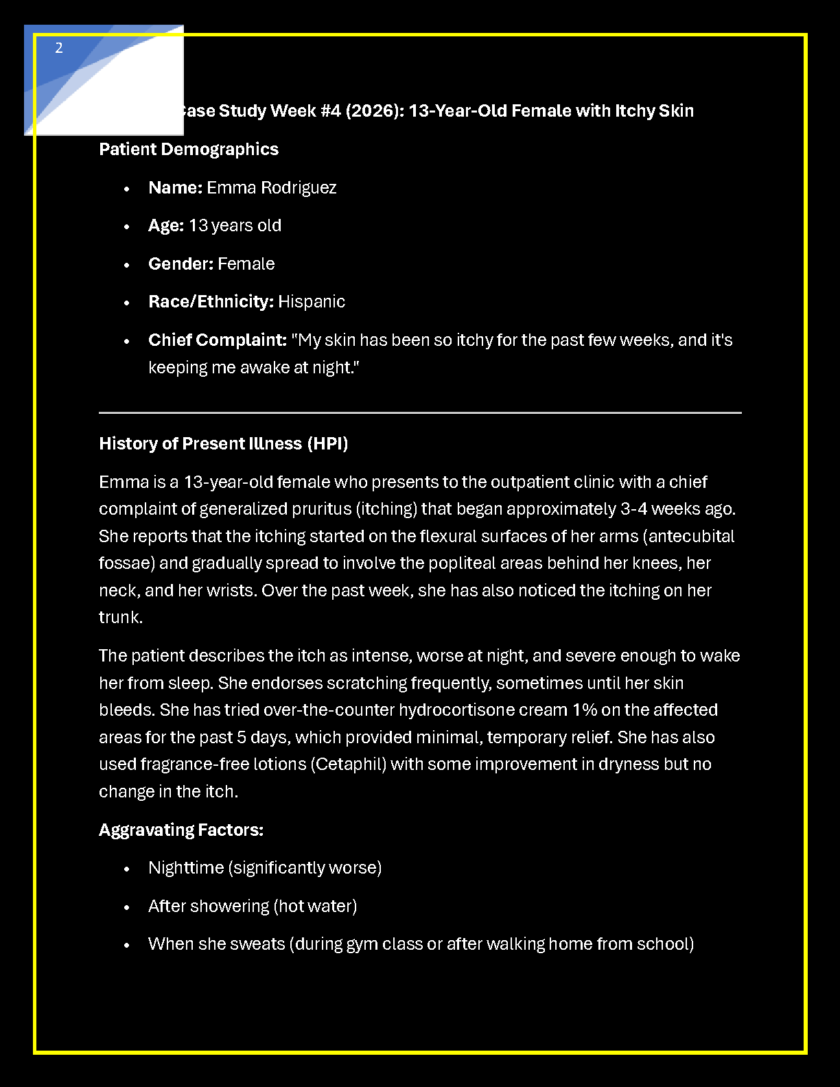 Ensure your academic success for the 2025/2026 school year with this comprehensive walkthrough of the i-Human Week 4 case study. This guide focuses on a 13-year-old female patient presenting with itchy skin in an outpatient setting. Authored by the i-Human Patients Academic Team, this resource provides a complete breakdown of the History of Present Illness (HPI), Review of Systems (ROS), and Physical Examination. It offers detailed insights into the diagnostic workup, differential diagnosis prioritization, final diagnosis, and an evidence-based management plan including patient education. This premium resource is specifically designed to help medical and nursing students master clinical simulations, pass their exams on the first try, and avoid the need for resits.