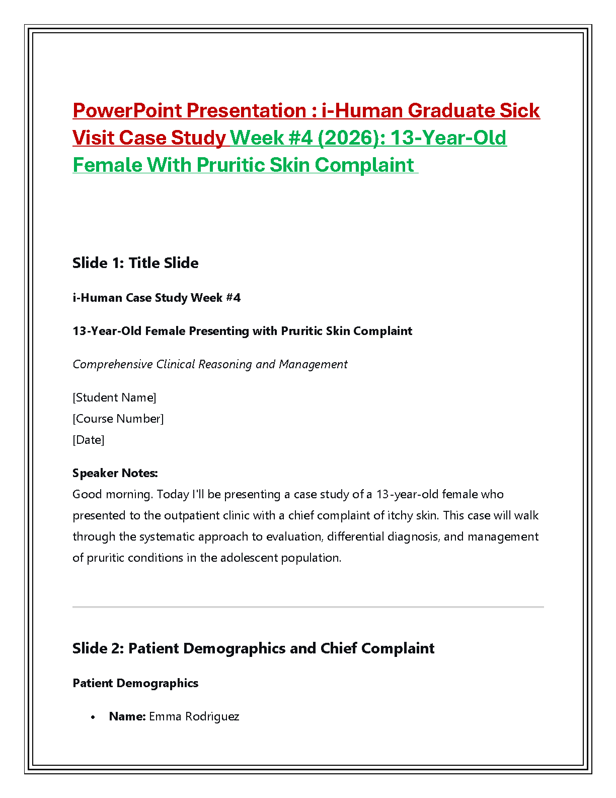 Unlock success in your clinical assessments with this detailed i-Human graduate case study involving 13-year-old Emma Rodriguez. Focused on a pruritic skin complaint, this 2025/2026 resource walks you through systematic evaluation, differential diagnosis, and management strategies. It includes comprehensive speaker notes and clinical reasoning pathways specifically designed to help graduate students master the i-Human platform and pass their exams on the first attempt, effectively avoiding resits.