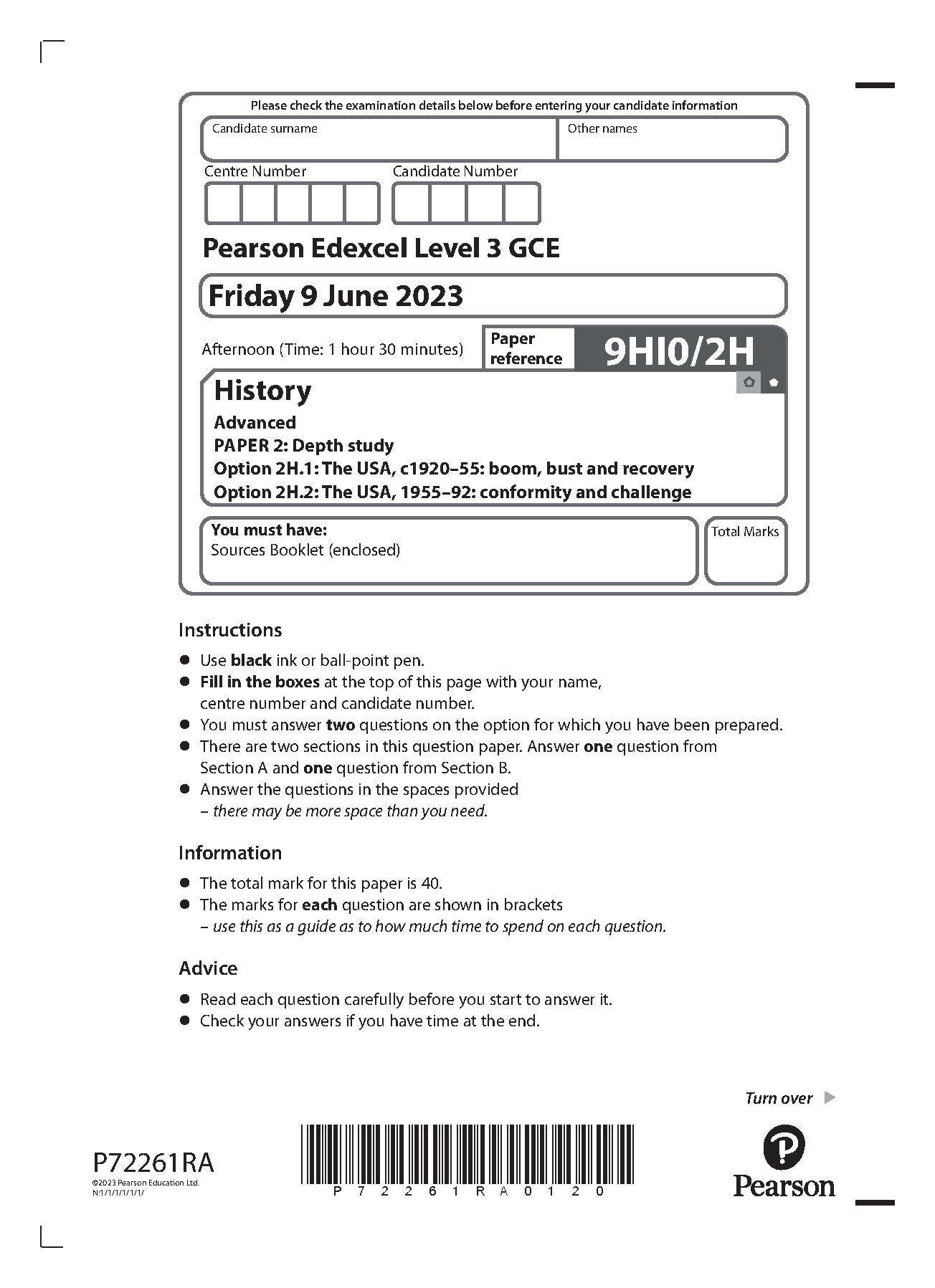 PEARSON EDEXCEL A LEVEL HISTORY PAPER 2 2023 (9HI0/2H: Depth Study Option 2H.1: The USA, C1920–55: Boom, Bust And Recovery Option 2H.2: The USA, 1955–92: Conformity And Challenge)