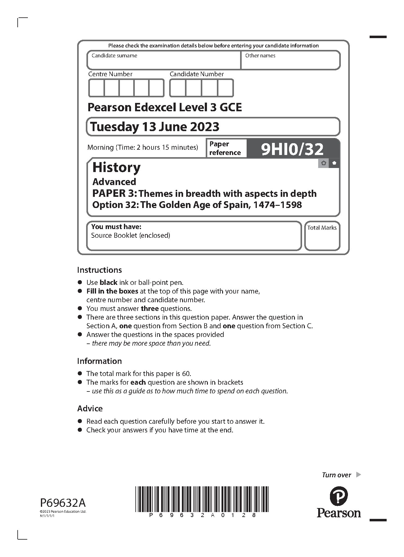 PEARSON EDEXCEL A LEVEL HISTORY PAPER 3 2023 (9HI0/32: Themes In Breadth With Aspects In Depth Option 32: The Golden Age Of Spain, 1474–1598)