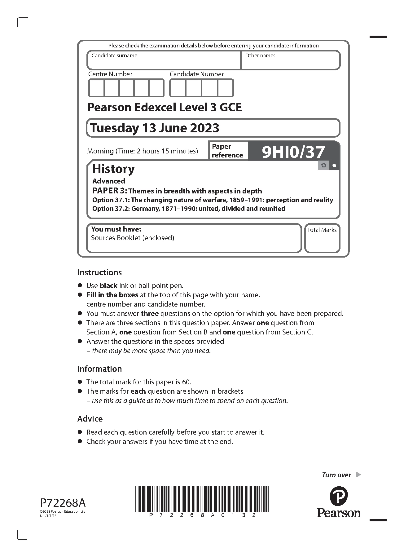 PEARSON EDEXCEL A LEVEL HISTORY PAPER 3 2023 (9HI0/37: Themes In Breadth With Aspects In Depth Option 37.1: The Changing Nature Of Warfare, 1859–1991: Perception And Reality Option 37.2: Germany, 1871–1990: United, Divided And Reunited)
