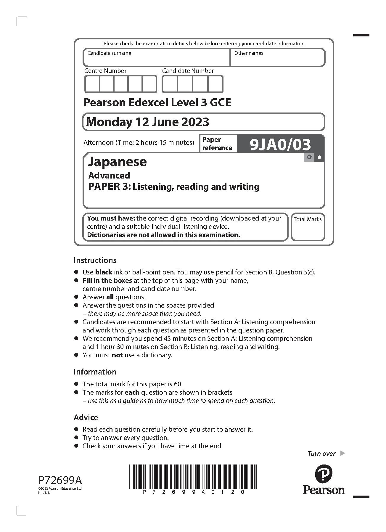 PEARSON EDEXCEL A LEVEL JAPANESE PAPER 3 2023 (9JA0/03: Listening, Reading And Writing)