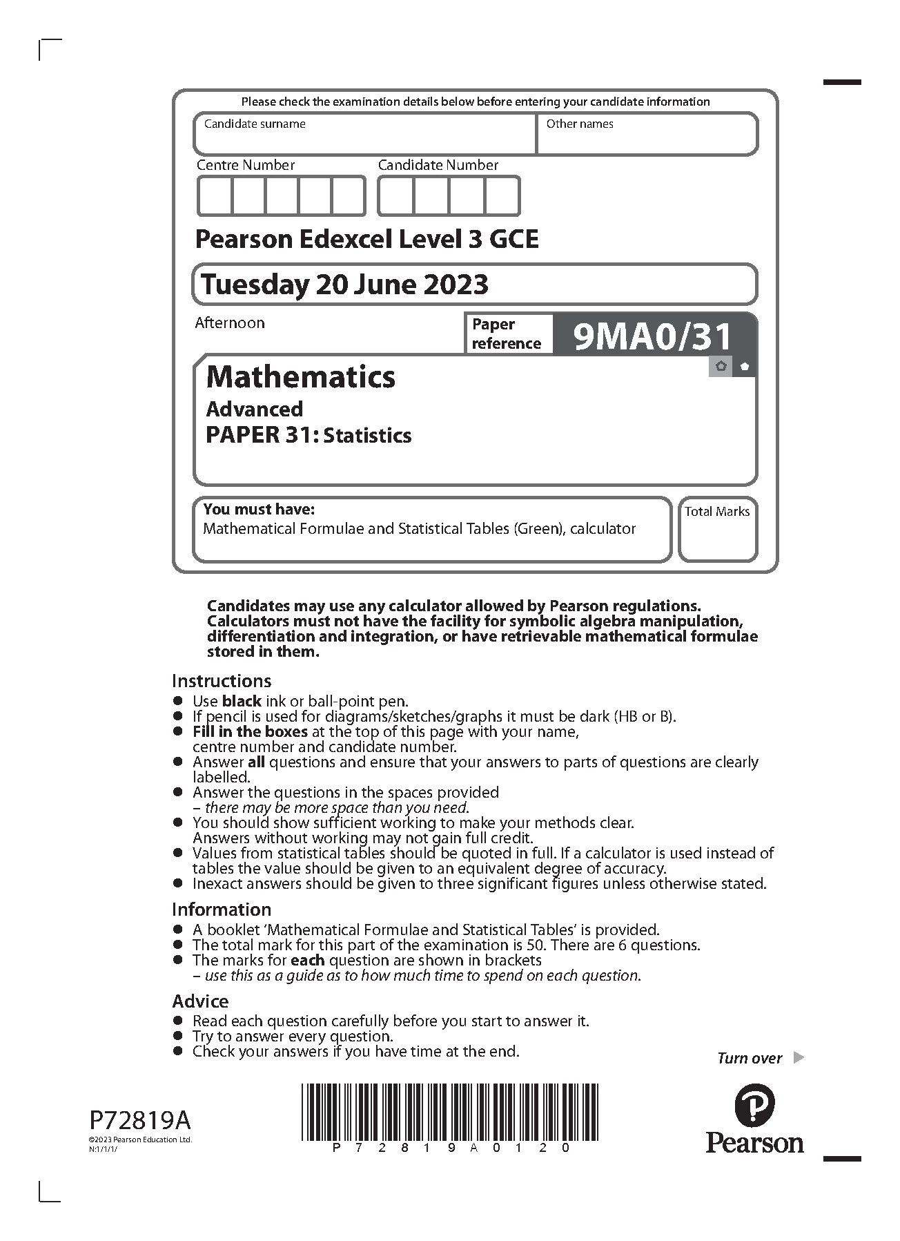 PEARSON EDEXCEL A LEVEL MATHEMATICS PAPER 31 2023 (9MA0/31: Statistics)