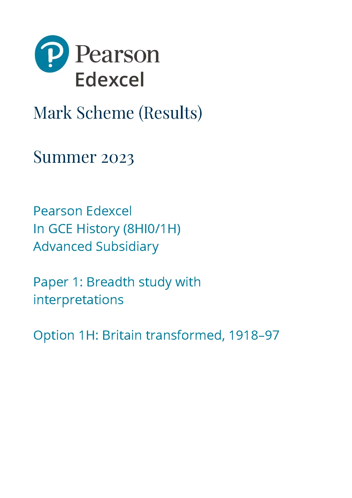 PEARSON EDEXCEL AS History PAPER 1 2023 MARK SCHEME (8HI0/1H: Breadth study with interpretations - Britain transformed, 1918–97). DOWNLOAD on www.hackedexams.com INSTANTLY.