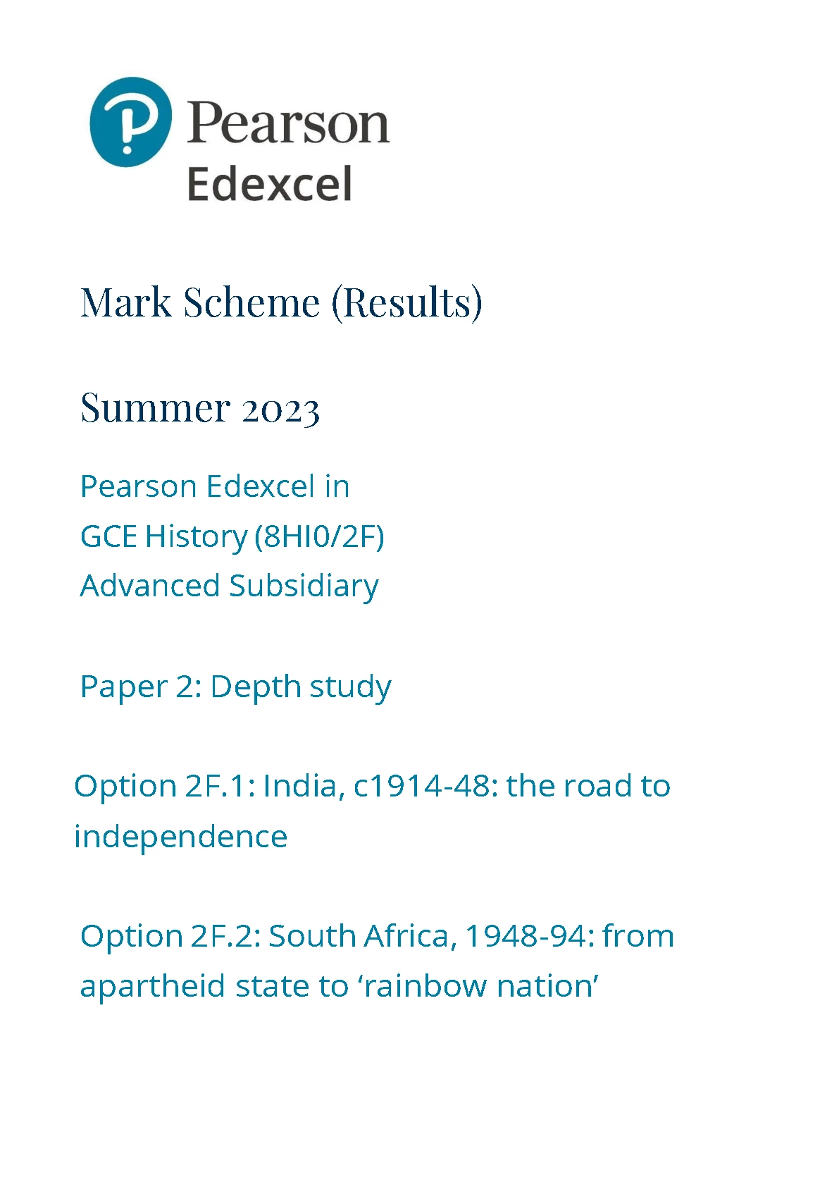 PEARSON EDEXCEL AS History PAPER 2 2023 MARK SCHEME (8HI0/2F: Depth study - India, c1914-48: the road to independence & South Africa, 1948-94: from apartheid state to ‘rainbow nation’)