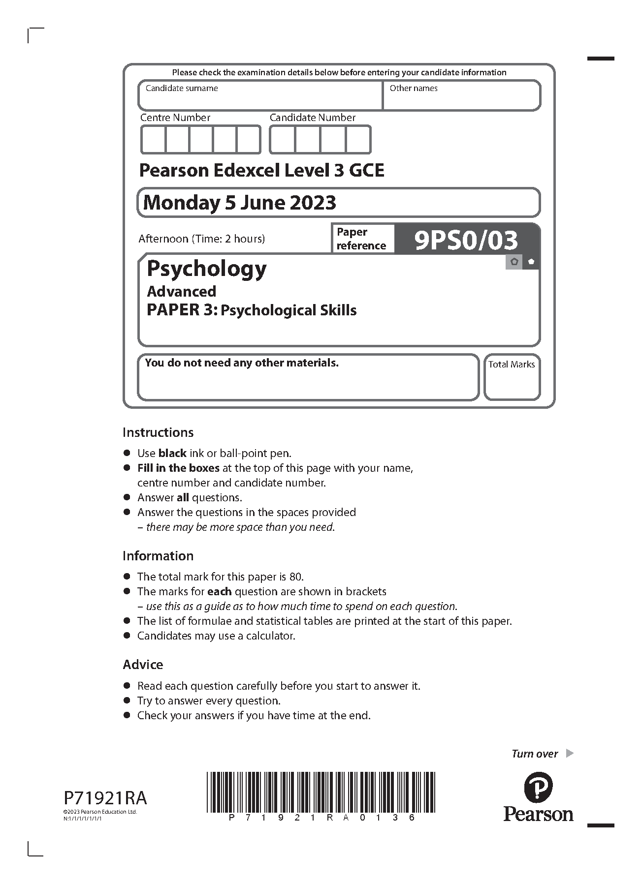 PEARSON EDEXCEL A LEVEL PSYCHOLOGY PAPER 3 2023 (9PS0/03: Psychological Skills)