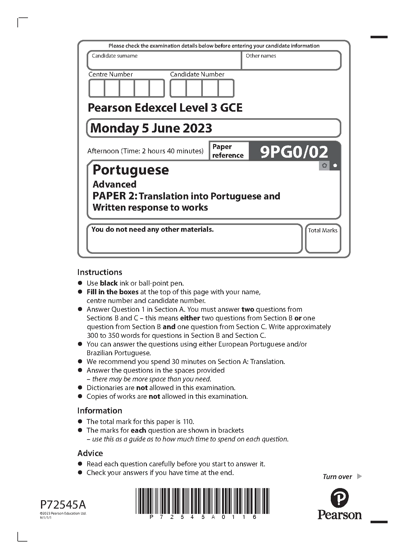 PEARSON EDEXCEL A LEVEL PORTUGUSE PAPER 2 2023 (9PG0/02: Translation Into Portuguese And Written Response To Works)