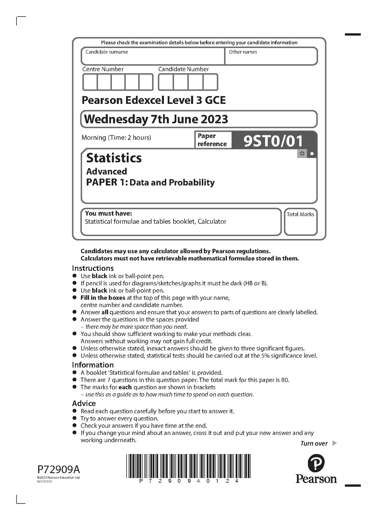 Pearson Edexcel A Level Statistics Paper 1 2023 (9ST0/01: Data And Probability)