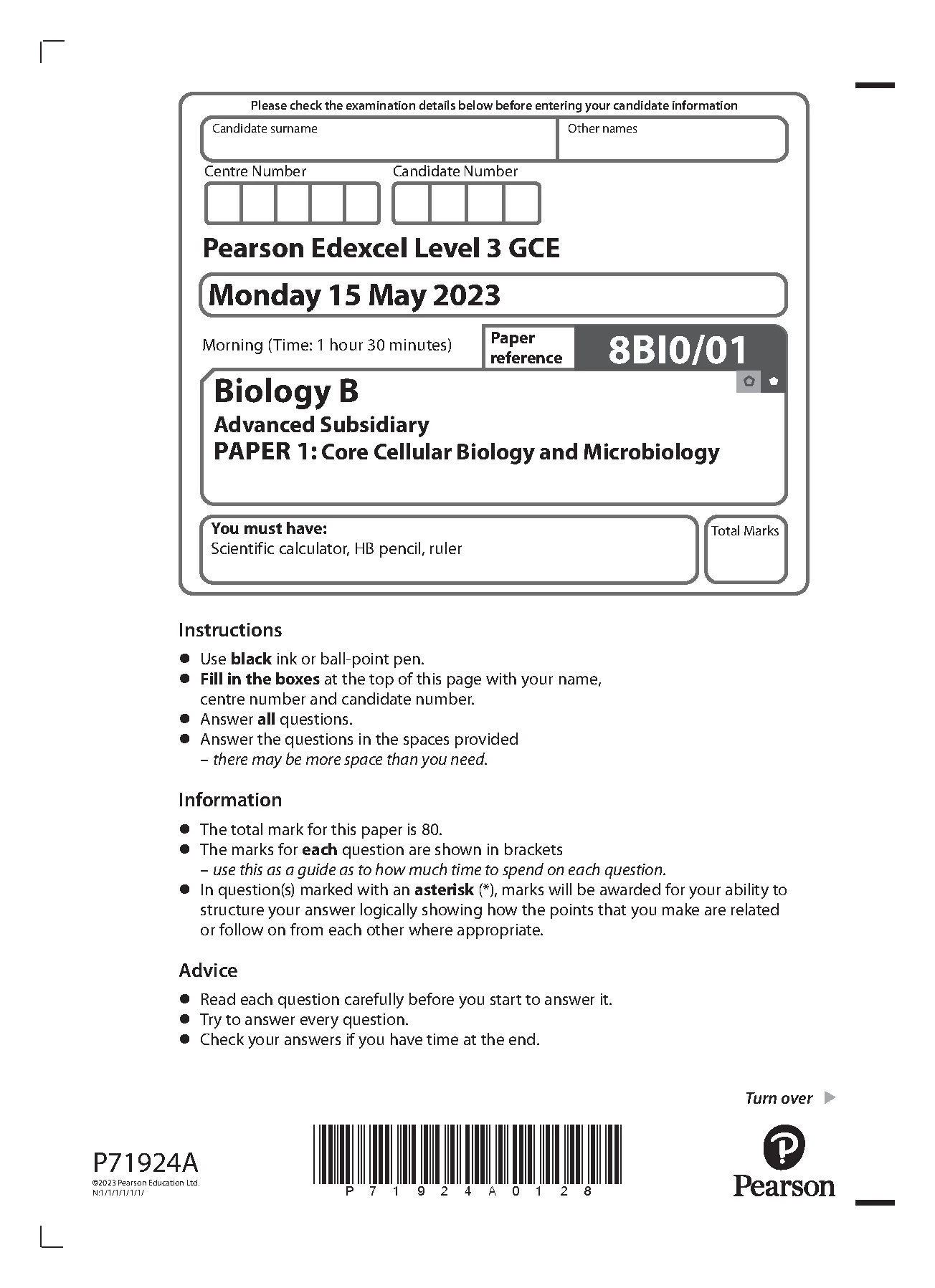 PEARSON EDEXCEL AS BIOLOGY B PAPER 1 2023 (8BI0/01: Core Cellular Biology And Microbiology)