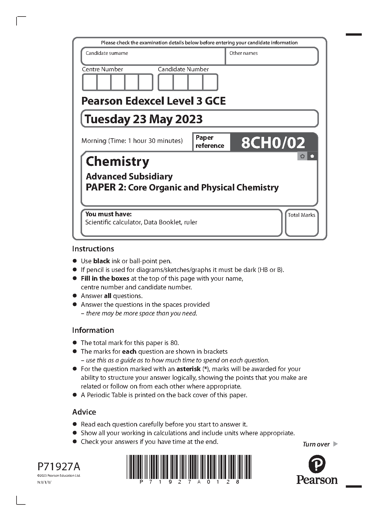 Pearson Edexcel AS Chemistry Paper 2 2023 (8CH0/02: Core Organic and Physical Chemistry)
