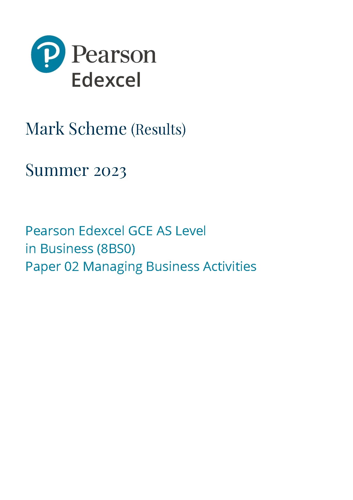 PEARSON EDEXCEL AS Business PAPER 2 2023 MARK SCHEME (8BS0/02: Managing Business Activities)