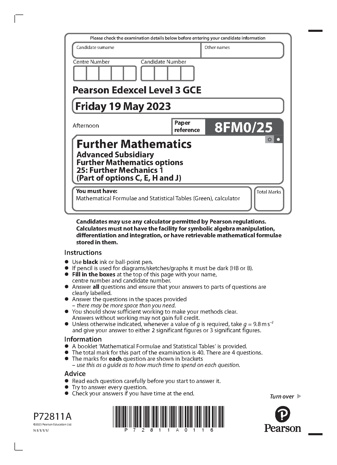 PEARSON EDEXCEL AS FURTHER MATHEMATICS PAPER 25 2023 (8FM0/25: Further Mechanics 1 (Part Of Options C, E, H And J))