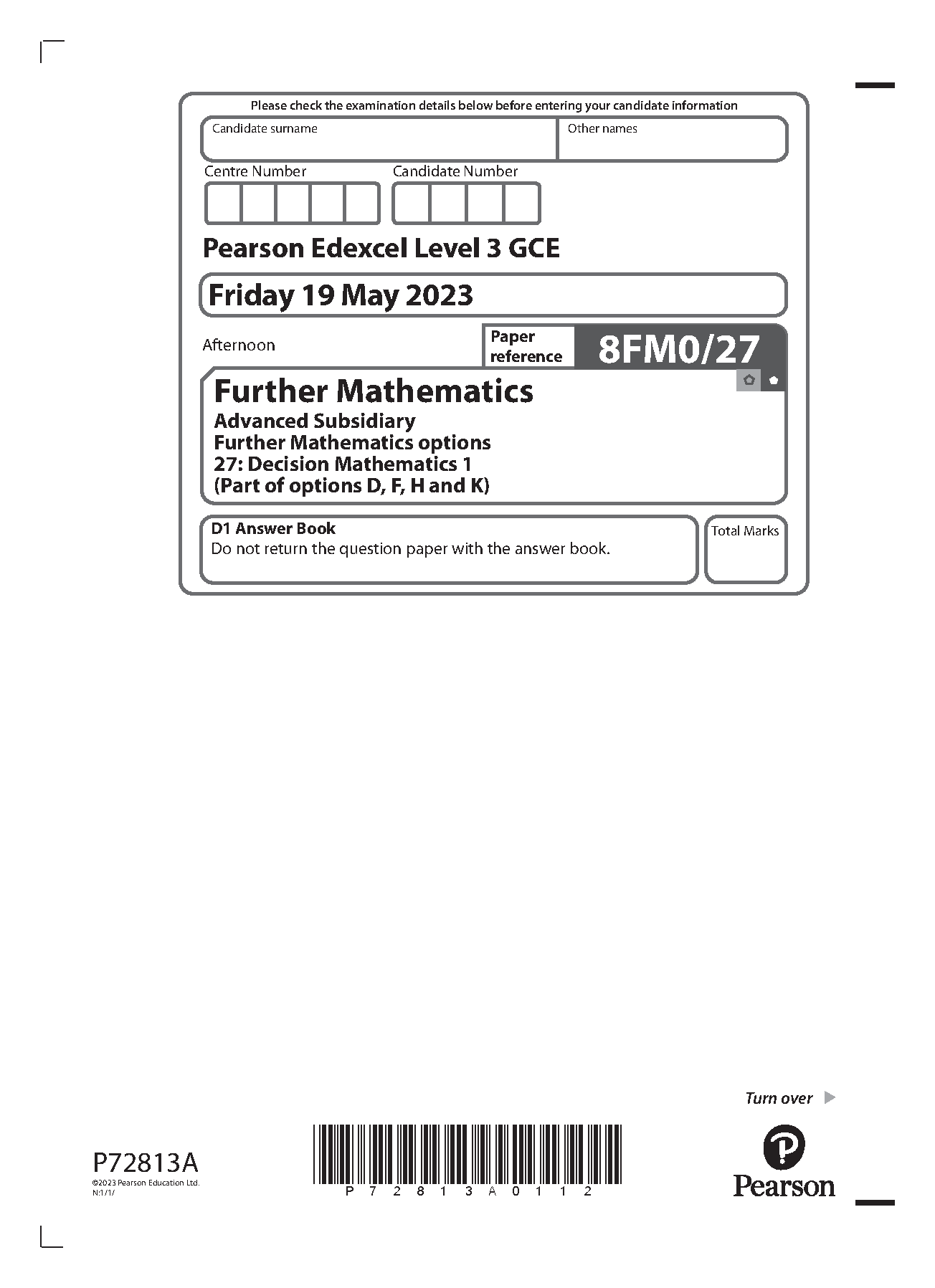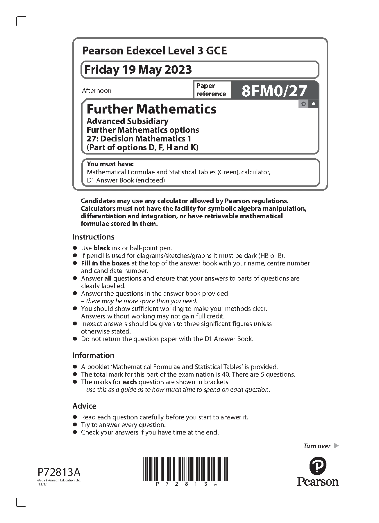 PEARSON EDEXCEL AS FURTHER MATHEMATICS PAPER 27 2023 (8FM0/27: Decision Mathematics 1 (Part Of Options D, F, H And K))