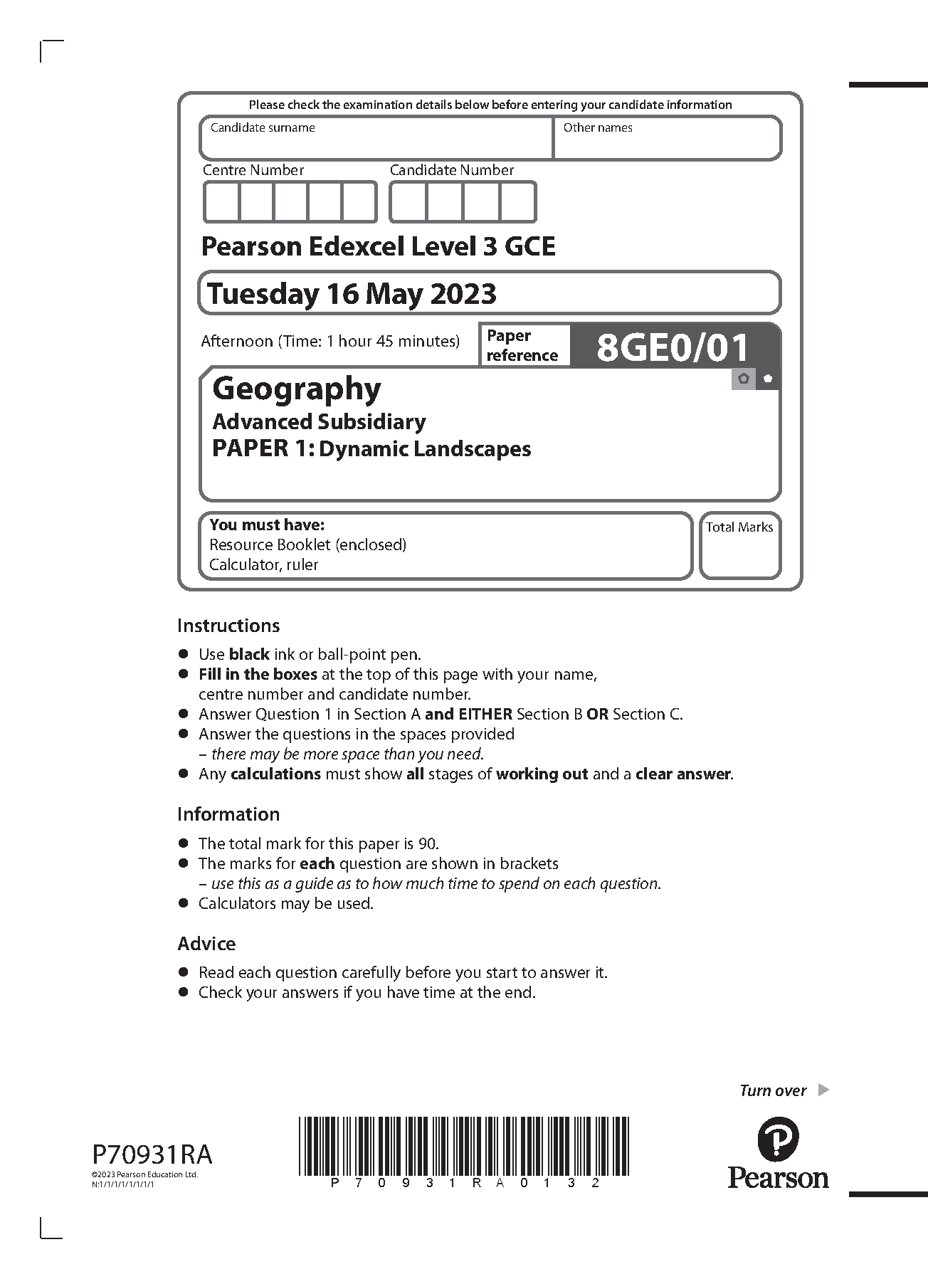 PEARSON EDEXCEL A LEVEL GEOGRAPHY PAPER 1 2023 (8GE0/01: Dynamic Landscapes)