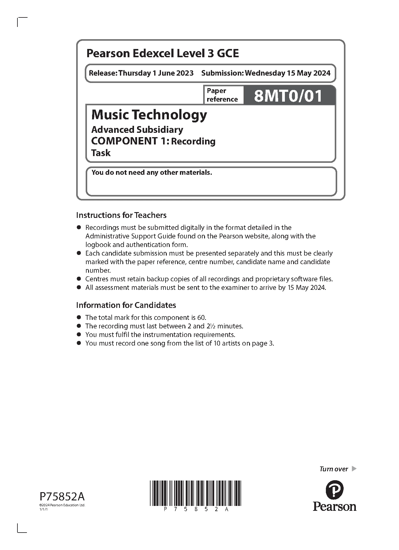 PEARSON EDEXCEL AS MUSIC TECHNOLOGY PAPER 1 2023 (8MT0/01: COMPONENT 1: Recording Task)