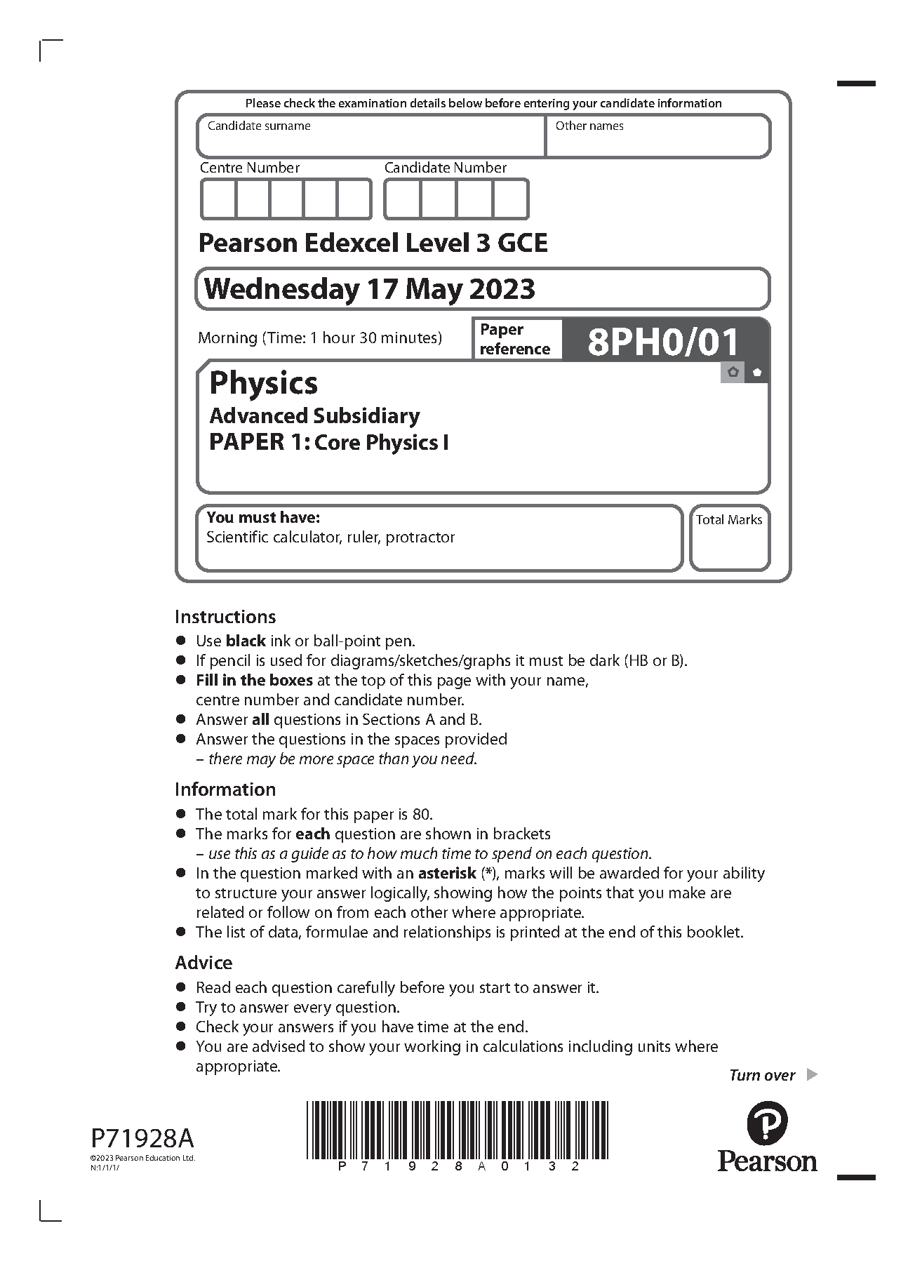 PEARSON EDEXCEL AS PHYSICS PAPER 1 2023 (8PH0/01: Core Physics I)