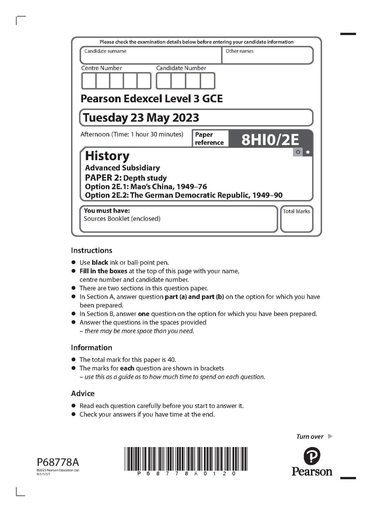 PEARSON EDEXCEL AS HISTORY PAPER 2 2023 (8HI0/2E: Depth Study Option 2E.1: Mao’s China, 1949–76 Option 2E.2: The German Democratic Republic, 1949–90)