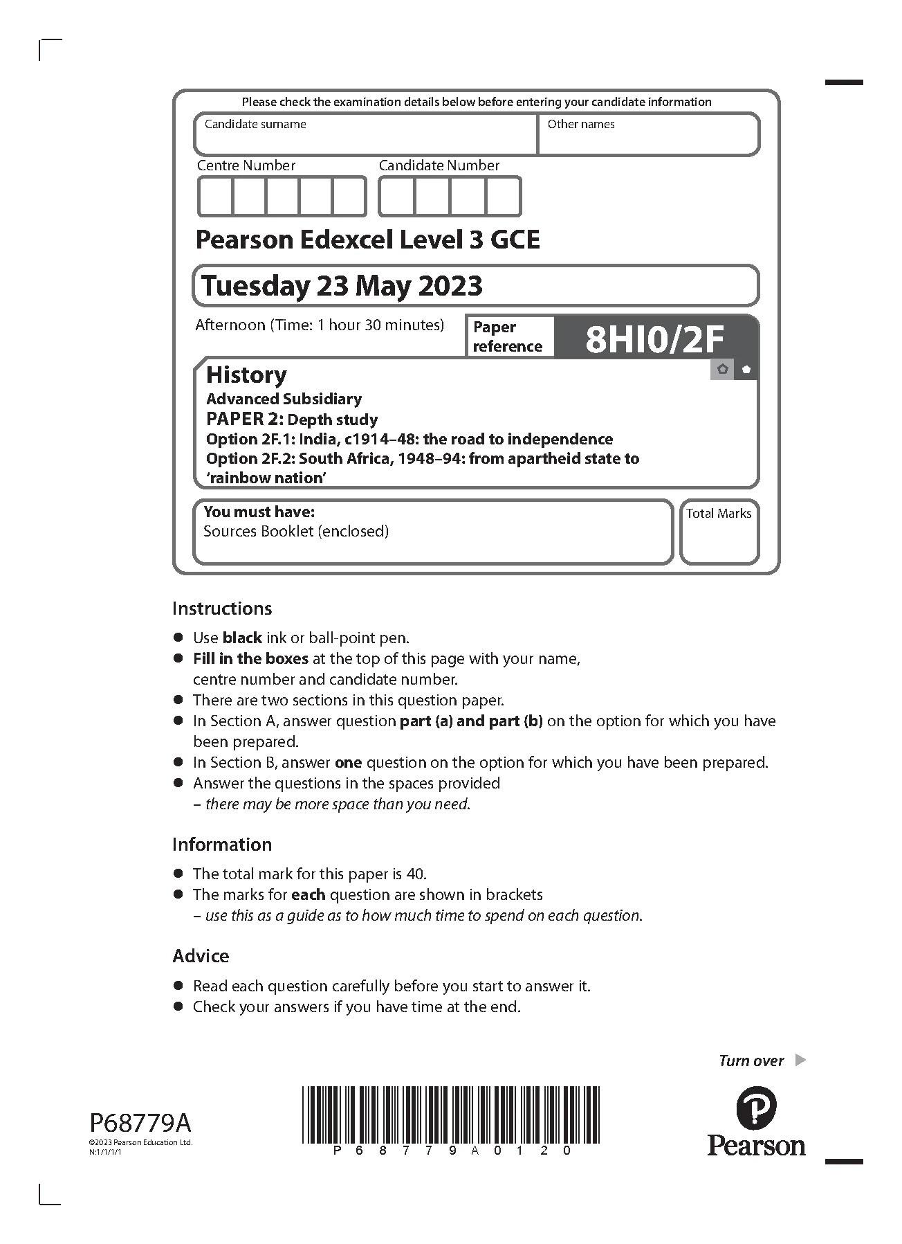 PEARSON EDEXCEL AS HISTORY PAPER 2 2023 (8HI0/2F: Depth Study Option 2F.1: India, C1914–48: The Road To Independence Option 2F.2: South Africa, 1948–94: From Apartheid State To ‘Rainbow Nation’)