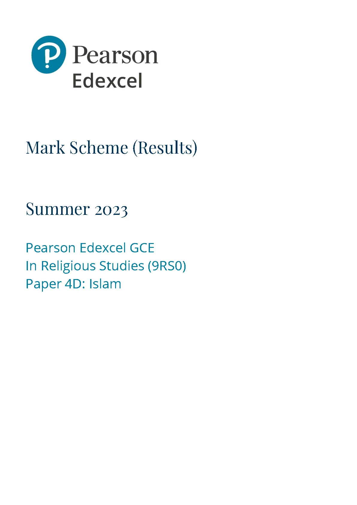 PEARSON EDEXCEL A LEVEL Religious Studies PAPER 4 2023 MARK SCHEME (9RS0/4D: Islam). DOWNLOAD OFFICIAL AND VERIFIED EDEXCEL PEARSON A LEVEL Religious Studies PAPER 4 2023 on www.hackedexams.com INSTANTLY.