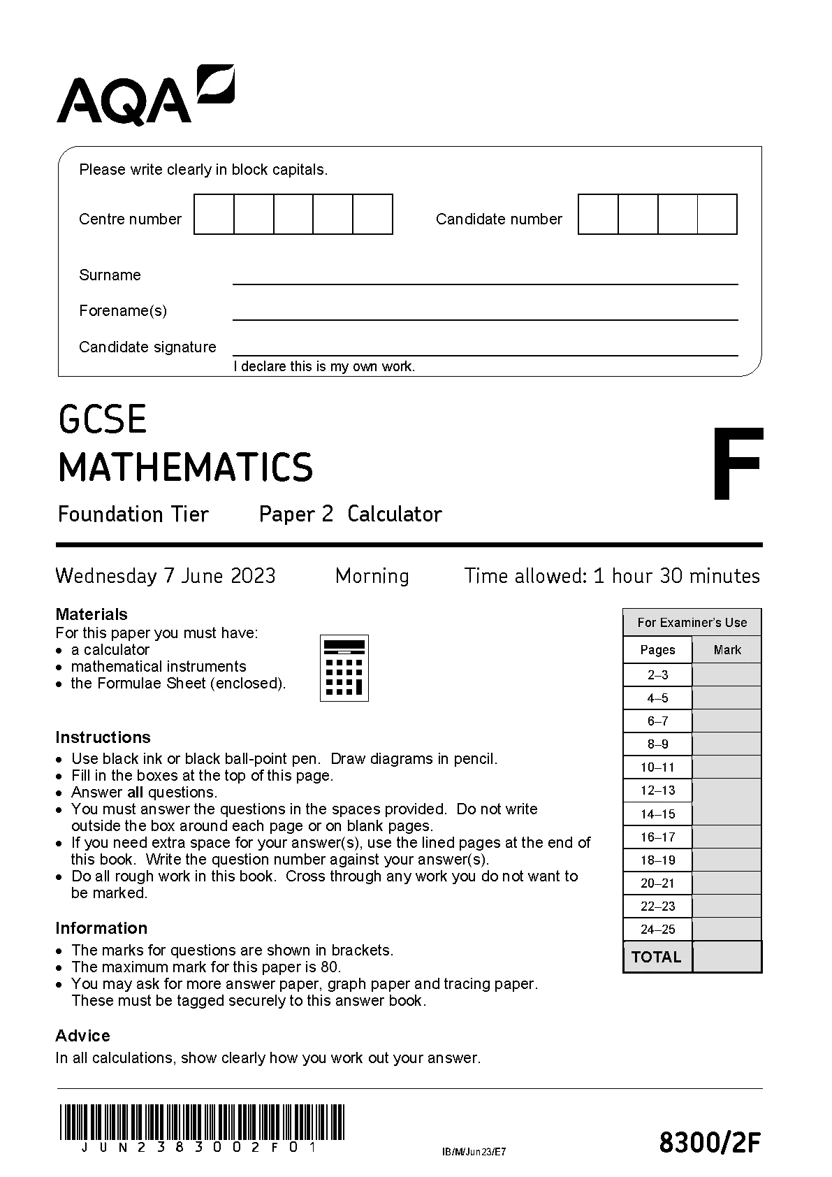AQA GCSE MATHEMATICS PAPER 2 2023 (8300/2F:Foundation Tier - Calculator)