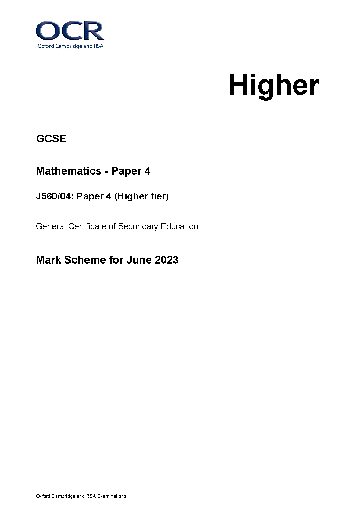 OCR GCSE MATHEMATICS PAPER 4 2023 MARK SCHEME (J560/04: Higher Tier)