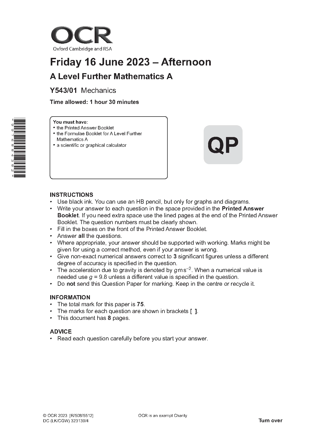 OCR A LEVEL FURTHER MATHEMATICS A PAPER 1 2023 (Y543/01: Mechanics)