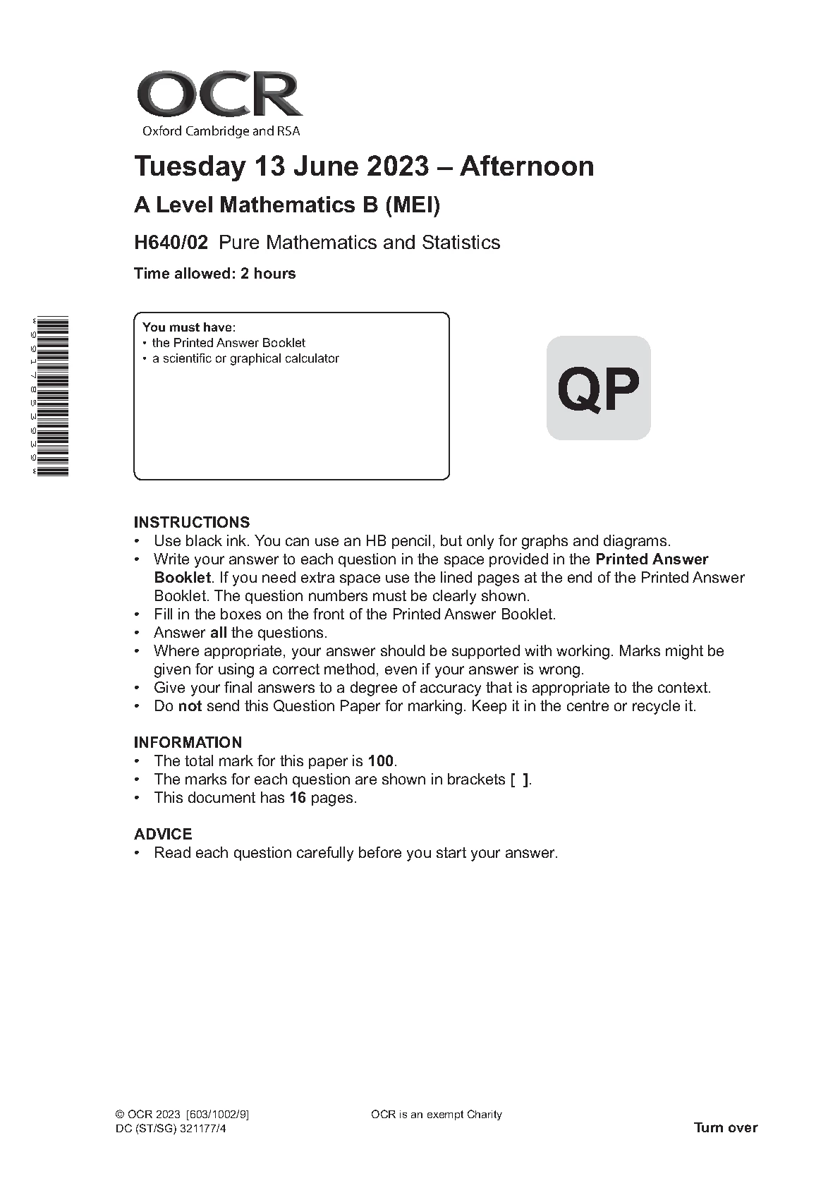 OCR A LEVEL Mathematics B PAPER 2 2023 (H640/02: Pure Mathematics and Statistics)