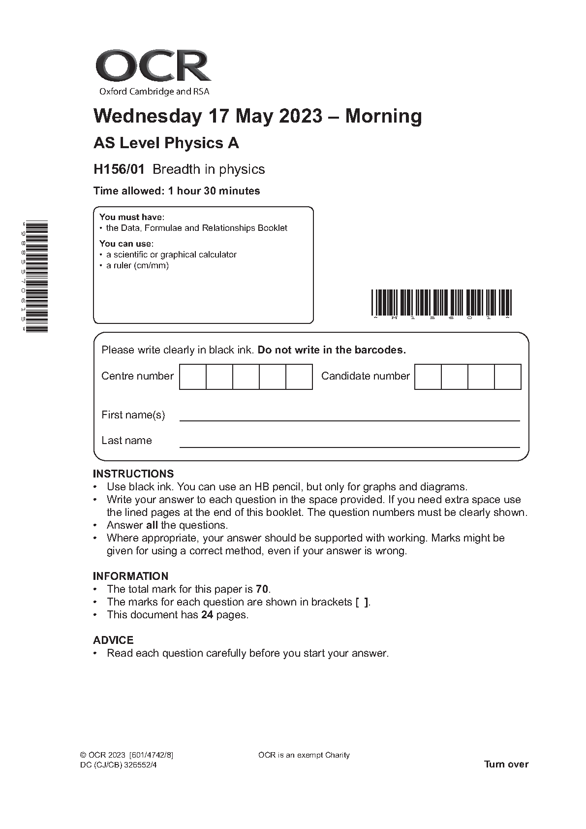 OCR AS Physics A PAPER 1 2023 (H156/01: Breadth in physics). DOWNLOAD OFFICIAL AND VERIFIED OCR AS Physics A PAPER 1 2023 on Hackedexams.com INSTANTLY.