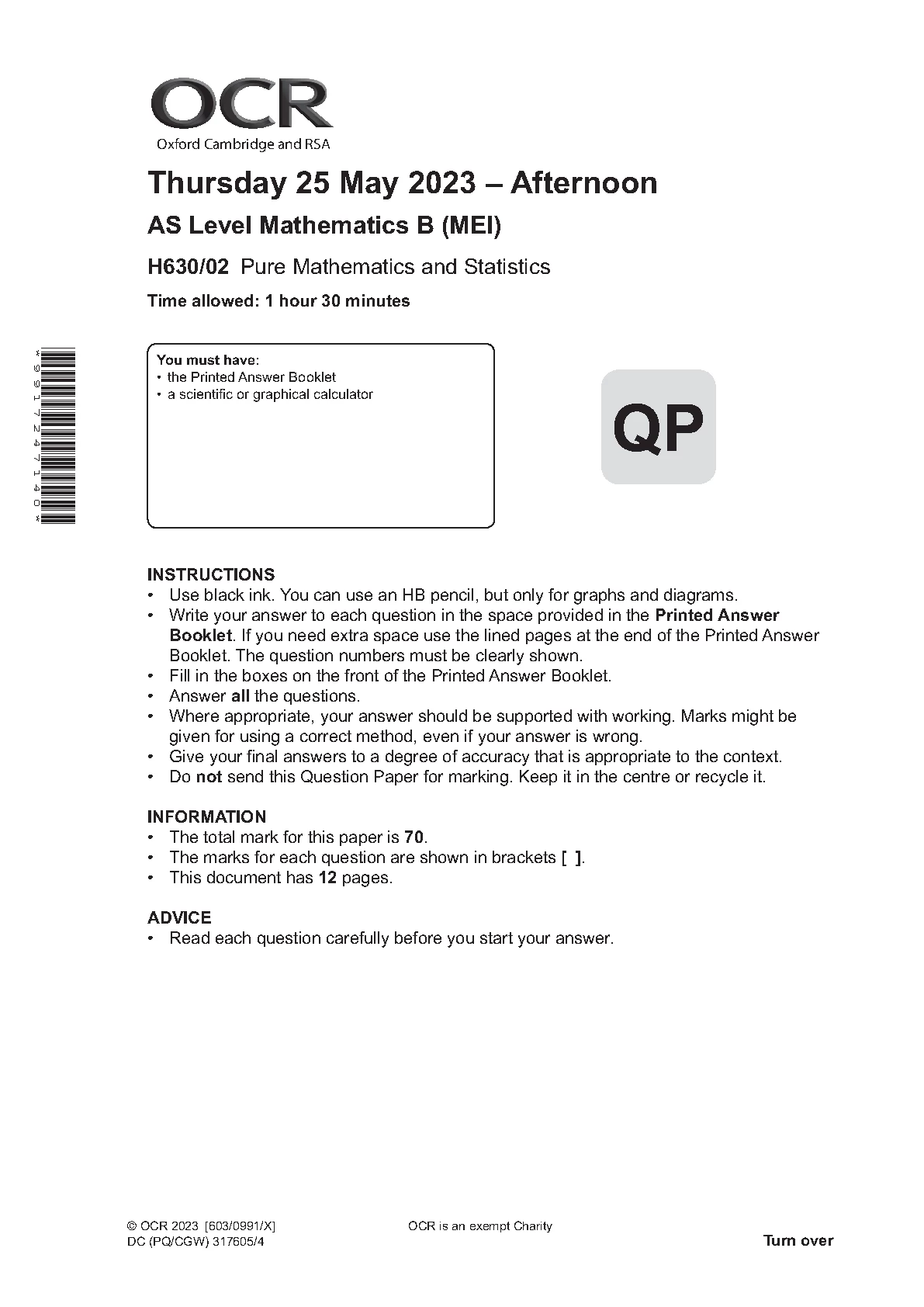 OCR AS Mathematics B PAPER 2 2023 (H630/02: Pure Mathematics and Statistics)