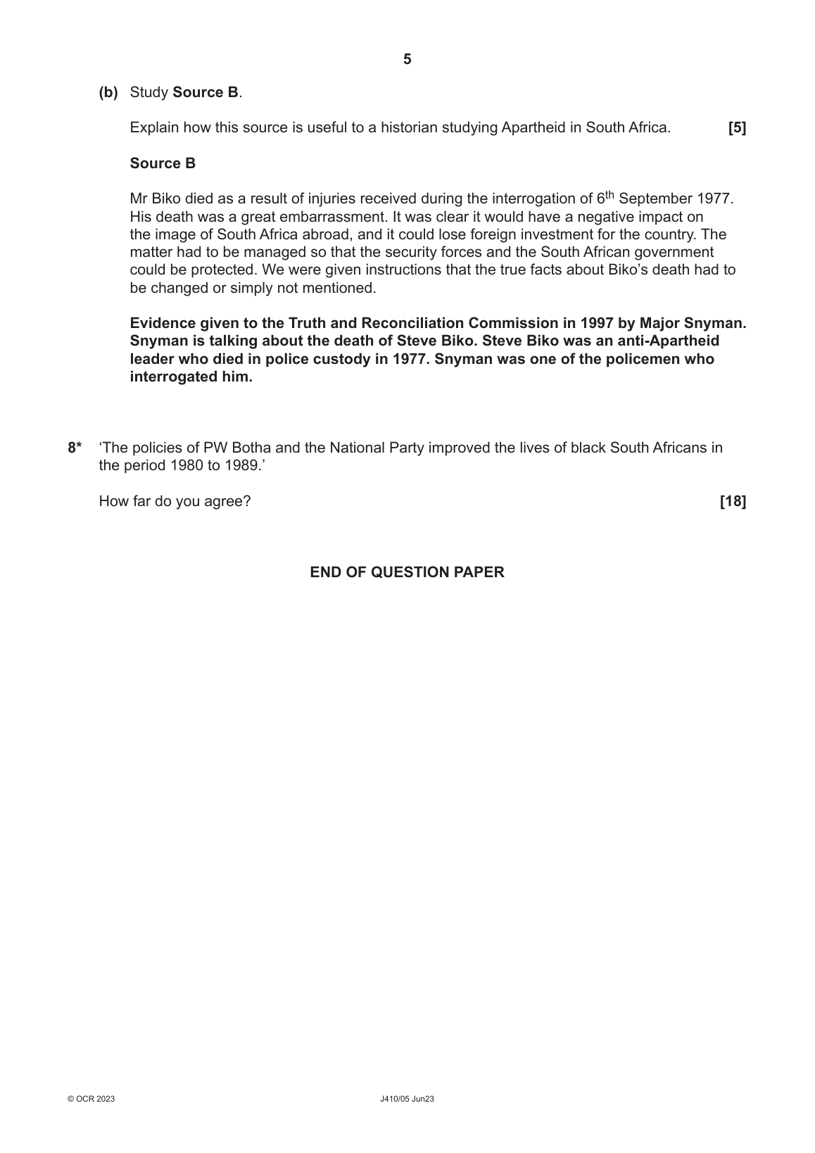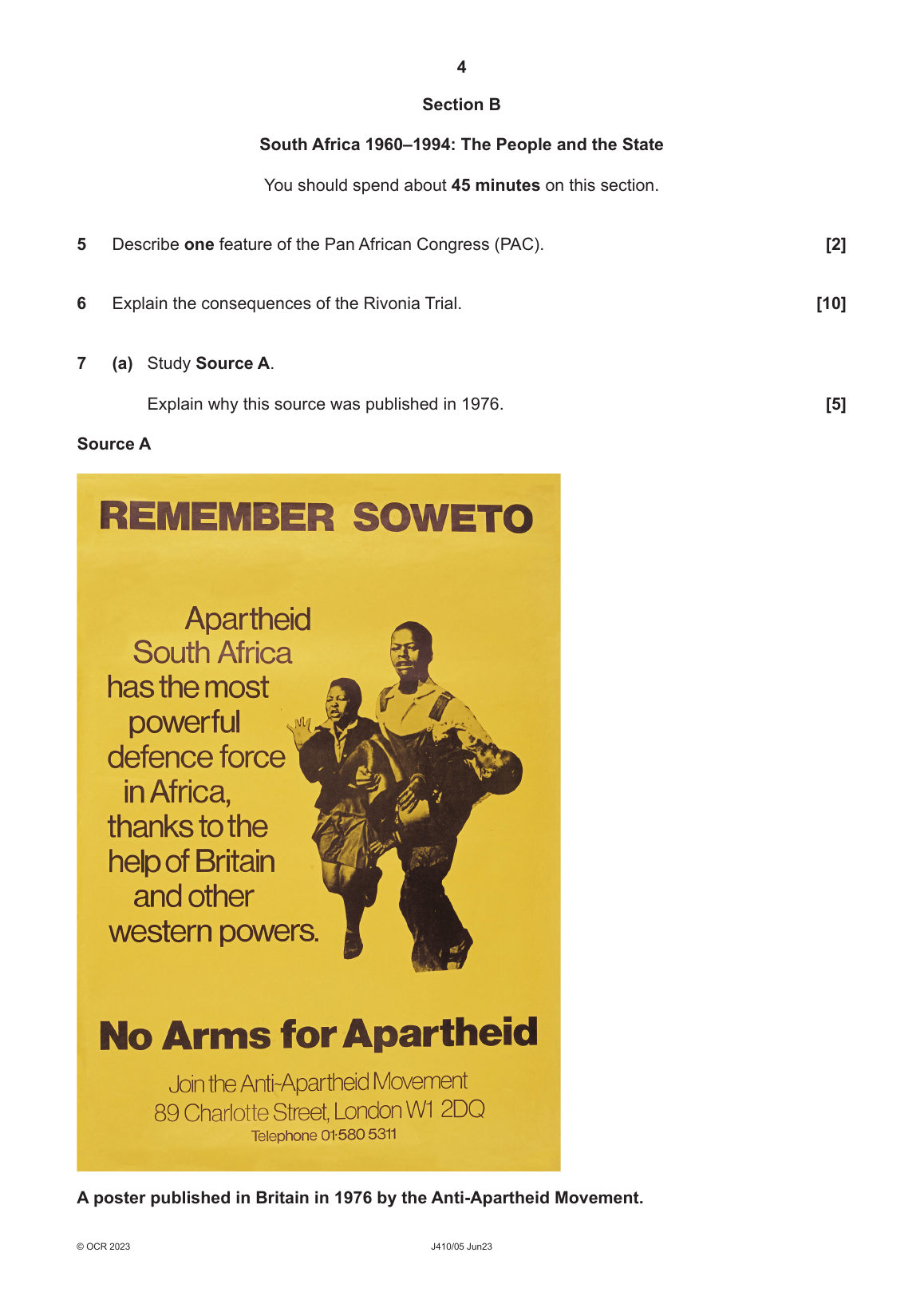OCR GCSE History A PAPER 5 2023 (J410/05: International Relations: the changing international order 1918–c.1975 with South Africa 1960–1994: The People and the State)