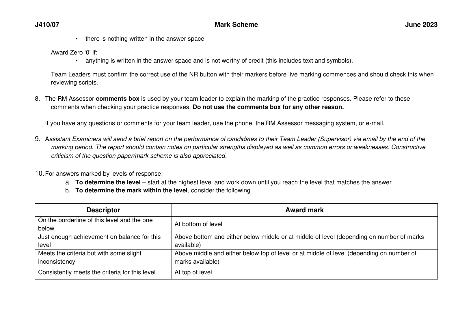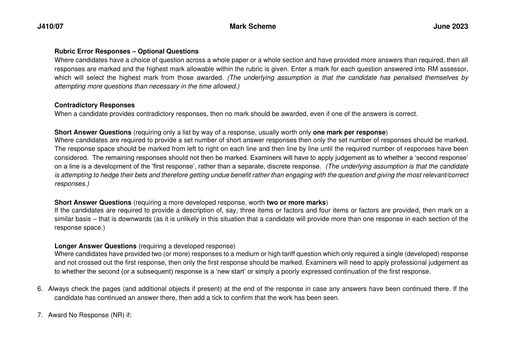 OCR GCSE History A PAPER 7 2023 MARK SCHEME (J410/07: International Relations: the changing international order 1918–c.1975 with The USA 1945-1974: The People and the State)